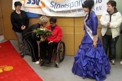 Bevor Harry Janz den Startschuss gab, überreichte Oberbürgermeisterin Dietlind Tiemann Martina Willing, Silbermedaillengewinnerin im Speerwurf bei den Weltmeisterschaften in Neuseeland, einen Blumenstrauß und gratulierte ihr noch einmal persönlich.