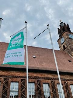 Gemeinsam mit Vertretern der Stadtverordnetenversammlung hat Walter Paaschen, Vorsitzender der Stadtverordnetenversammlung, am heutigen Donnerstag die Fahne „Mayors for Peace“ vor dem Altstädtischen Rathaus gehisst, um damit symbolisch ein Zeichen der Forderung nach einer Abschaffung aller Atomwaffen weltweit zu setzen.