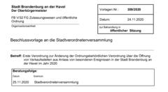 Für den hochwahrscheinlichen Fall der Verlängerung der Corona-Eindämmungsverordnung des Landes Brandenbug hat die Stadtverordnetenversammlung vorsorglich beschlossen (Vorlage – Nummer 310/2020), über das Entfallen des verkaufsoffenen Sonntags am 13.12.2020 (3. Advent) per Umlaufbeschluss zu entscheiden.