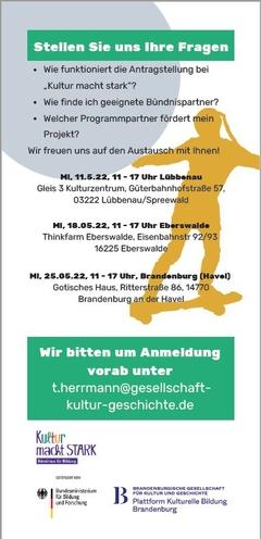 Am Mittwoch, dem 25. Mai 2022, findet von 11:00 bis 17:00 Uhr die Veranstaltungsreihe „Kultur macht stark im Dialog“ im Gotischen Haus statt. Der Veranstalter, die Brandenburgische Gesellschaft für Kultur und Geschichte gGmbH, bietet vor Ort die Möglichkeit, das Bundesprogramm und die Arbeit der Servicestelle Brandenburg kennenzulernen, oder sich grundsätzlich oder projektspezifisch über die aktuellen Fördermöglichkeiten zu informieren und gibt Anregungen für die dritte Förderphase in den Jahren 2023 – 2027. Die zweite Förderphase von Kultur macht stark geht im Dezember 2022 zu Ende.