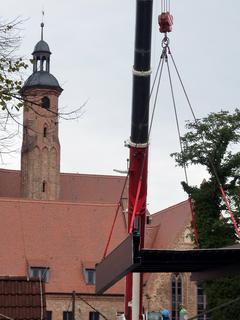 Seit dem Anfang Juni 2010 in Brandenburg an der Havel der Grundstein für den Neubau einer Fuß- und Radwegbrücke über den Stadtkanal gelegt wurde, sind die Bauarbeiten an dieser wichtigen Verbindung zwischen Hauptbahnhof und Innenstadt bereits weit voran geschritten. Sichtbares Zeichen dafür ist die Montage des mächtigen Mittelteils der Stahlkonstruktion, die am 27.10.2010 erfolgte.