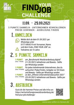 Des Weiteren beteiligt sich die Stadtverwaltung an der „FIND YOUR JOB-Challenge“, die in diesem Jahr erstmals durchgeführt wird. Jugendliche werden damit aufgefordert, sich aktiv mit ihrer beruflichen Zukunft und den teilnehmenden Unternehmen der „Offenen Unternehmensbesuche 2021“ auseinanderzusetzen.