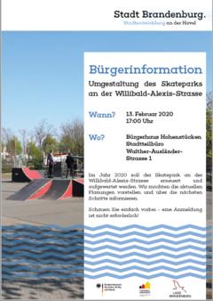 Am Donnerstag, dem 13.02.2020, lädt die Stadt Brandenburg an der Havel alle interessierten Bürgerinnen und Bürger zu einer Informationsveranstaltung nach Hohenstücken ein. Thema ist die Umgestaltung und Erweiterung des Skateparks an der Willibald-Alexis-Straße. Der vorliegende Planungsentwurf wird vorgestellt und über die nächsten Schritte informiert. Die Veranstaltung beginnt um 17:00 Uhr im Stadtteilbüro des Bürgerhauses Hohenstücken, Walther-Ausländer-Straße 1.