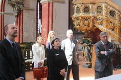 Weiter ging es mit einem Boot der Havel Marin vom Salzhofufer zum Dom. Dommuseumsleiter Dr. Rüdiger Frhr. von Schnurbein und der kaufmännischen Leiter Domstiftsrentmeister Dr. Wolframa Diederichs führten die Gäste durch den Dom zu Brandenburg. S.E. Herr Rafael Dezcallar de Mazarredo war so begeistert, dass er auch noch die St. Katharinenkirche besuchte. Ein kurzer Eintrag in das Kirchenbuch war der letzte offizielle Akt des spanischen Repräsentanten. Bei der Verabschiedung überreichte Oberbürgermeisterin Tiemann dem spanischen Botschafter noch einen Stadtkoffer, der mit aktuellen touristischen Broschüren der Havelstadt gefüllt war.
