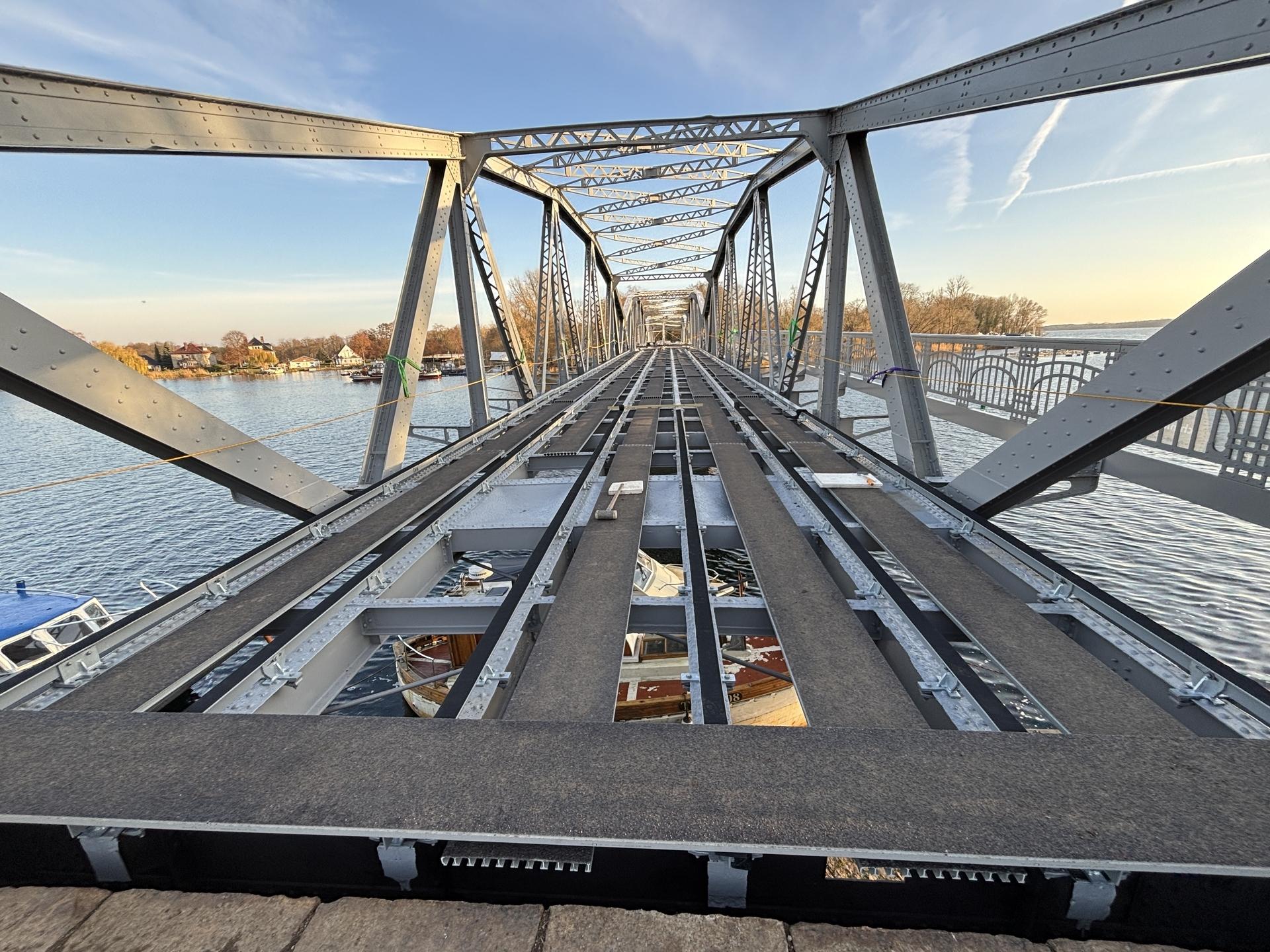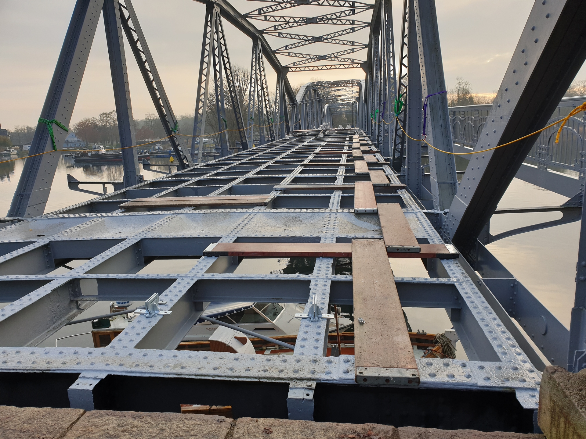 Die Ausführungsplanung ist abgeschlossen und geprüft, die Arbeiten an der Brücke gehen nun voran. Fugen, bei denen Rostwasser ausgetreten ist, wurden wieder erneuert und dicht verschlossen. Der GFK Bohlenbelag kann nun mit der Unterkonstruktion verbaut werden.