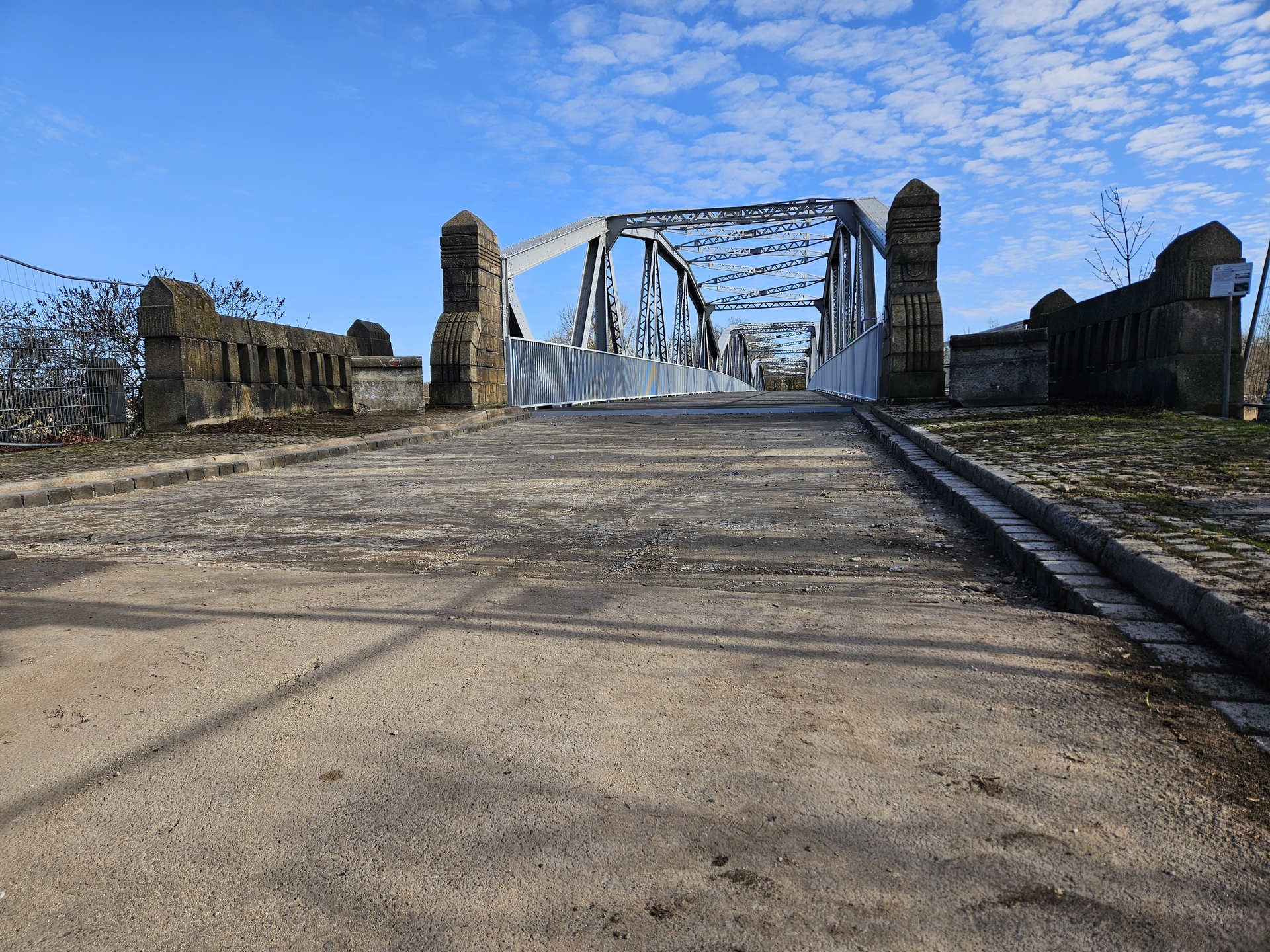 Der GFK Belag für die Alte Plauer Brücke wurde hergestellt und nun werden die Übergänge an den Rampen mittels Asphalt hergestellt. Es werden unter anderem kleine Anpassungsarbeiten vor den Übergängen vorgenommen.