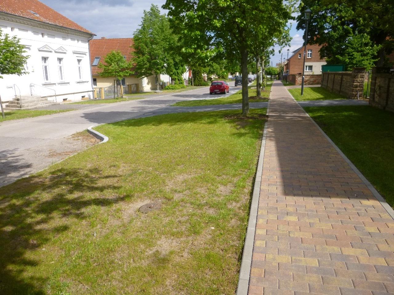 Die Neugestaltung des Bereiches der Straße Altes Dorf – Eingangsbereich zur Kirche und zum Friedhof wurden im Zeitraum 12.03. – 16.05.18 durch die Baufirma Beschorner und Otto GmbH aus Brandenburg ausgeführt. Die Umgestaltung des öffentlichen Verkehrsraumes zwischen der Haus Nummer 37 und der Einfahrt zum Grundstück Haus Nummer 35/35A umfasste insbesondere den Bereich zwischen der Fahrbahn und der Friedhofsmauer mit einer Gesamtlänge von 120 m. Zum Friedhof wurde erstmalig am vorhandenen Tor eine 3,10 m breite, barrierefreie Zufahrt hergestellt. Der Bereich des Zugangs zur Kirche und zum Friedhof an der Treppe wurde komplett erneuert. Die alte Treppenanlage ist komplett durch neue Betonstufen, mit einer Kennzeichnung für sehschwache Bürger ersetzt worden. Im Rahmen des Bauvorhabens ist auch der ca. 92 m lange vorhandene Gehweg mit Betonrechteckpflaster, Farbton „herbstbunt“ komplett erneuert worden. Am südlichen Fahrbahnrand bzw. im Bereich des vorhandenen Seitenstreifens wurden 9 Parkstände in Längsaufstellung neu angelegt. Die Parkflächen sind in zwei Abschnitten (1 x 4 und 1x 5 Parkstände), die durch den Zugang zur Kirche und zum Friedhof getrennt sind, geteilt. Zur Entwässerung der Stellflächen kam ein Dränfugenpflaster zum Einsatz. Das anfallende Regenwasser wird über eine neu angelegte Muldenrinne aus Beton in eine Geländevertiefung (Mulde) geführt und kann dort versickern. Die vorhandenen Lichtpunkte (Holzmasten) mit Freileitung vor der Kirche wurden durch drei neue Leuchten, einschließlich Erdkabel ersetzt und mittels Solarpaneel betrieben. Auf den Grünflächen zwischen Parkflächen und Gehweg sind Baumpflanzungen vorgenommen worden. Vorab wurden zwei alte Bäume gefällt. Die 2 neu gepflanzten Bäume (Brabanter Silberlinden) vervollständigen die vorhandene Baumreihe am Gehweg und nehmen in Flucht und Abstand den Alleecharakter der vorhandenen Gehölzpflanzungen auf. Der vorhandene Aufwuchs wurde im Grünbereich entfernt und mit einer Rasenansaat neu gestaltet.
