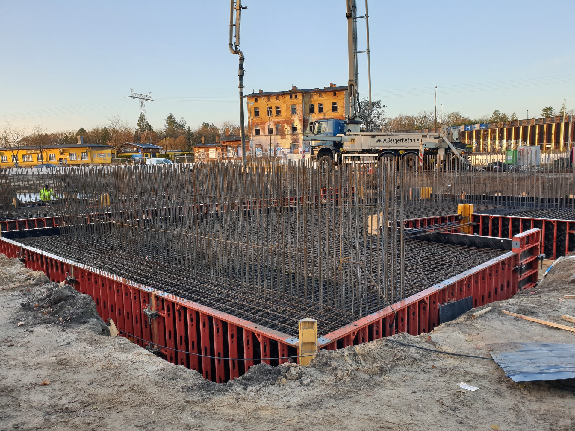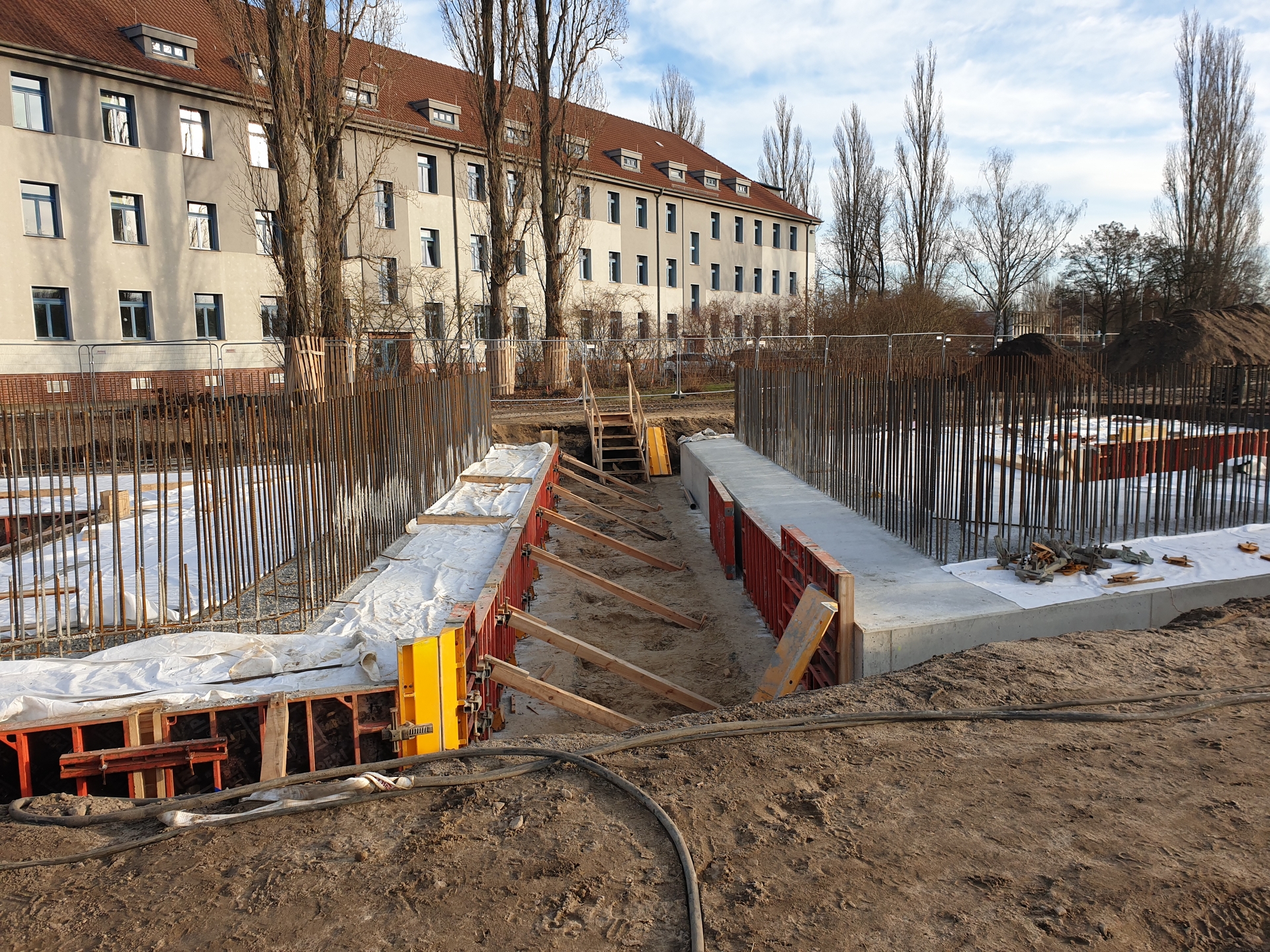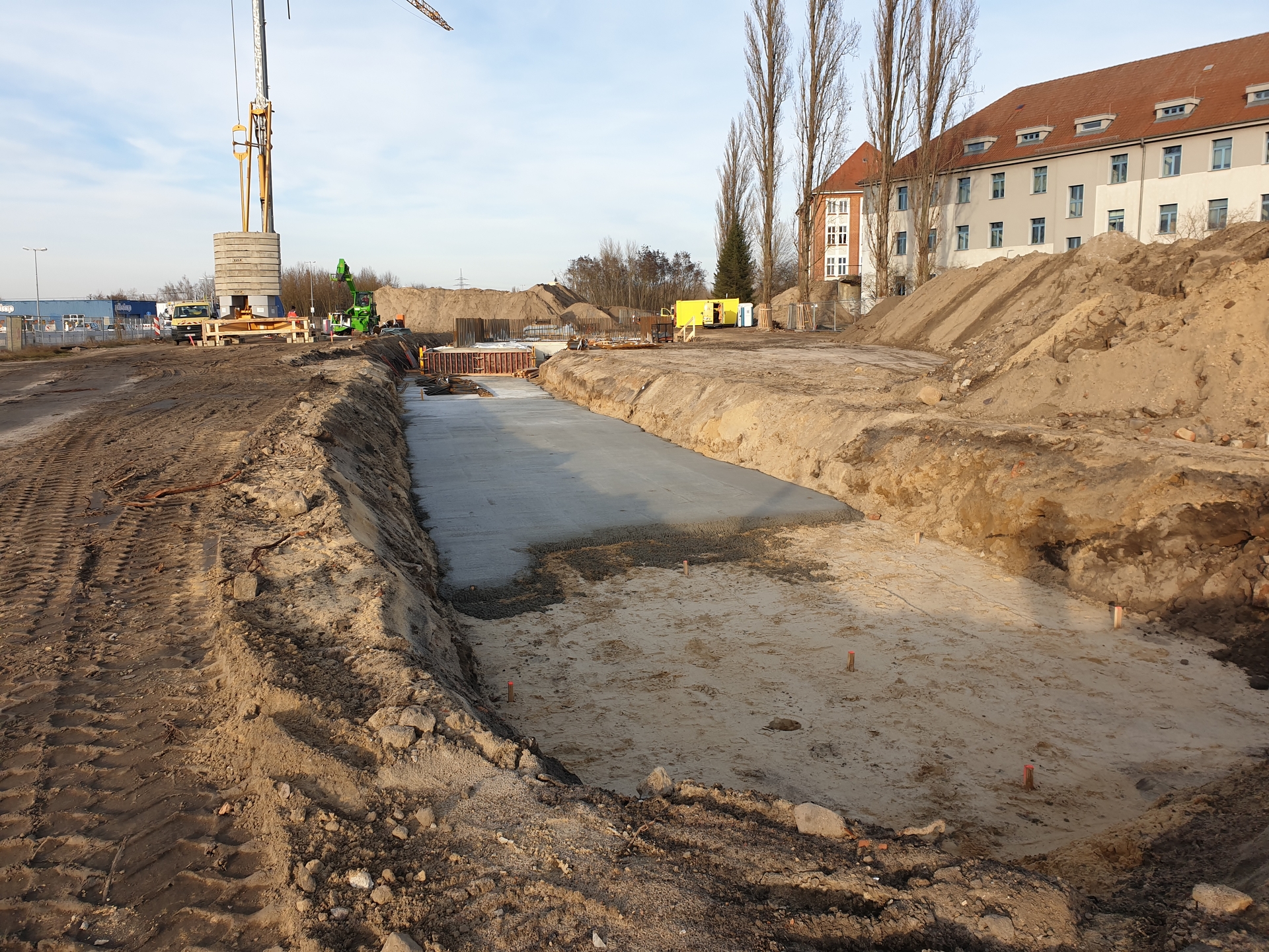 Die Reste des alten Rampenbauwerks werden abgetragen und zur Beprobung aufs Zwischenlager gebracht. Für den neuen Fußgängertunnel auf der Seite des Finanzamtes wurde die Grube fürs Fundament ausgehoben und ausgeschalt. Die andere Hälfte der Grube ist mit einer Betonsauberkeitsschicht ausgestattet, auf der das zweite Fundament für den Fußgängertunnel errichtet wird.In den kommenden Tagen wird die Stahlbewehrung zusammengeflochten und später betoniert.