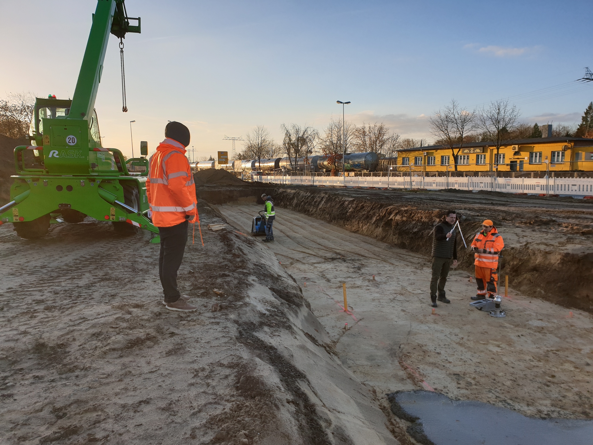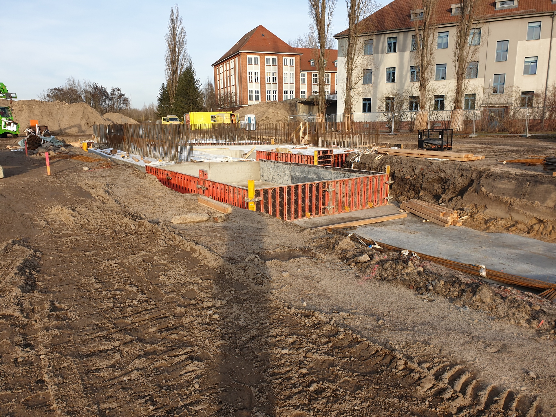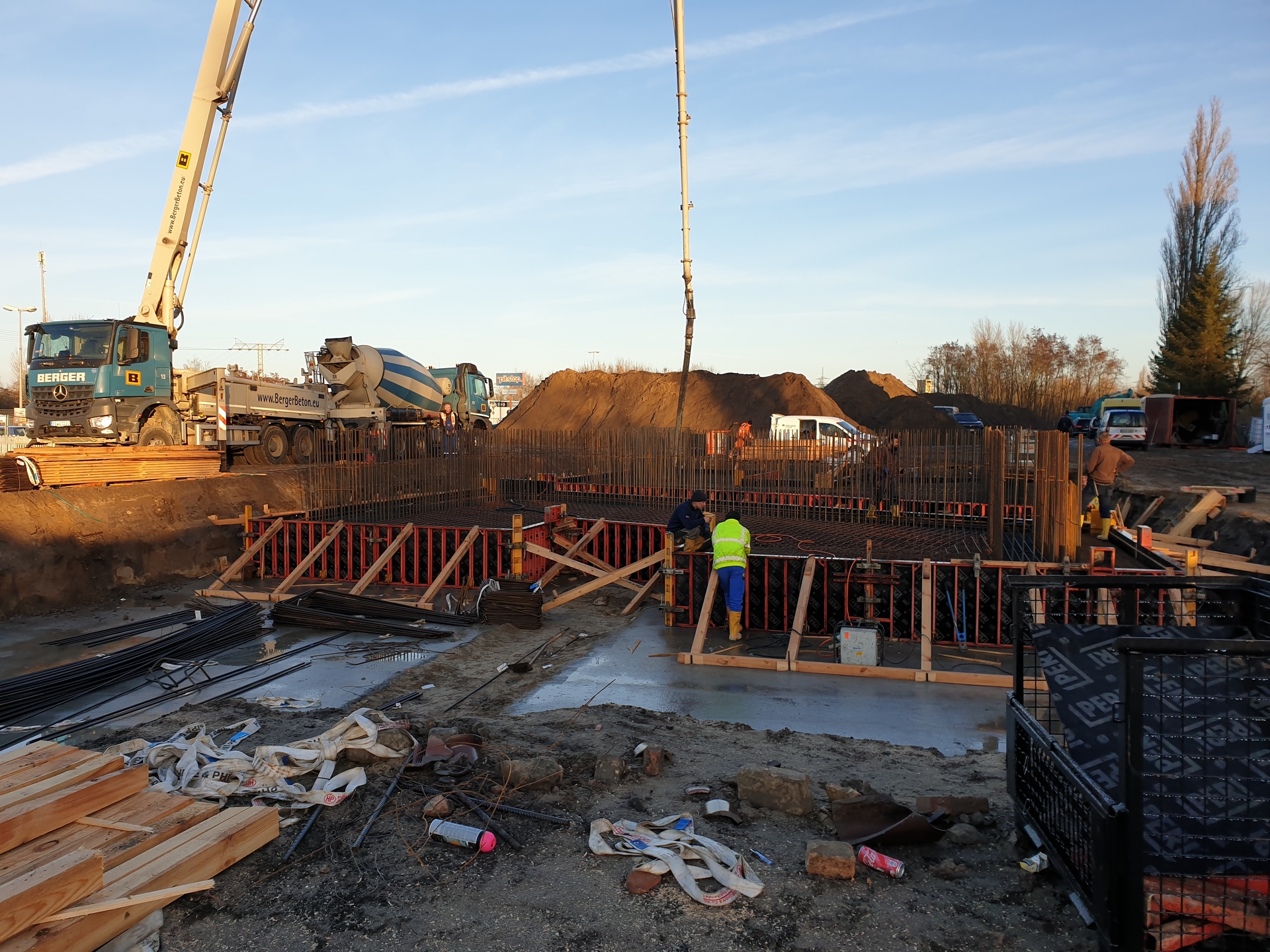 Die Reste des alten Rampenbauwerks werden abgetragen und zur Beprobung aufs Zwischenlager gebracht. Für den neuen Fußgängertunnel auf der Seite des Finanzamtes wurde die Grube fürs Fundament ausgehoben und ausgeschalt. Die andere Hälfte der Grube ist mit einer Betonsauberkeitsschicht ausgestattet, auf der das zweite Fundament für den Fußgängertunnel errichtet wird.In den kommenden Tagen wird die Stahlbewehrung zusammengeflochten und später betoniert.