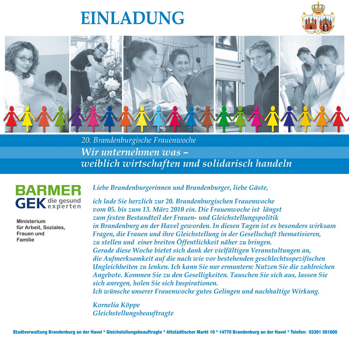 Ich lade Sie herzlich zur 20. Brandenburgischen Frauenwoche vom 05. bis zum 13. März 2010 ein, nutzen Sie die zahlreichen Angebote, tauschen Sie sich aus, lassen Sie sich anregen und holen Sie sich Inspirationen.