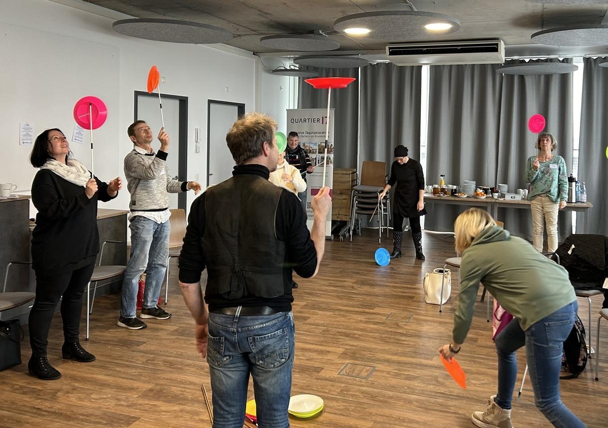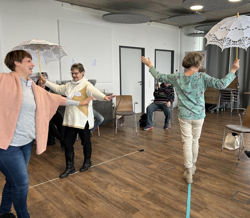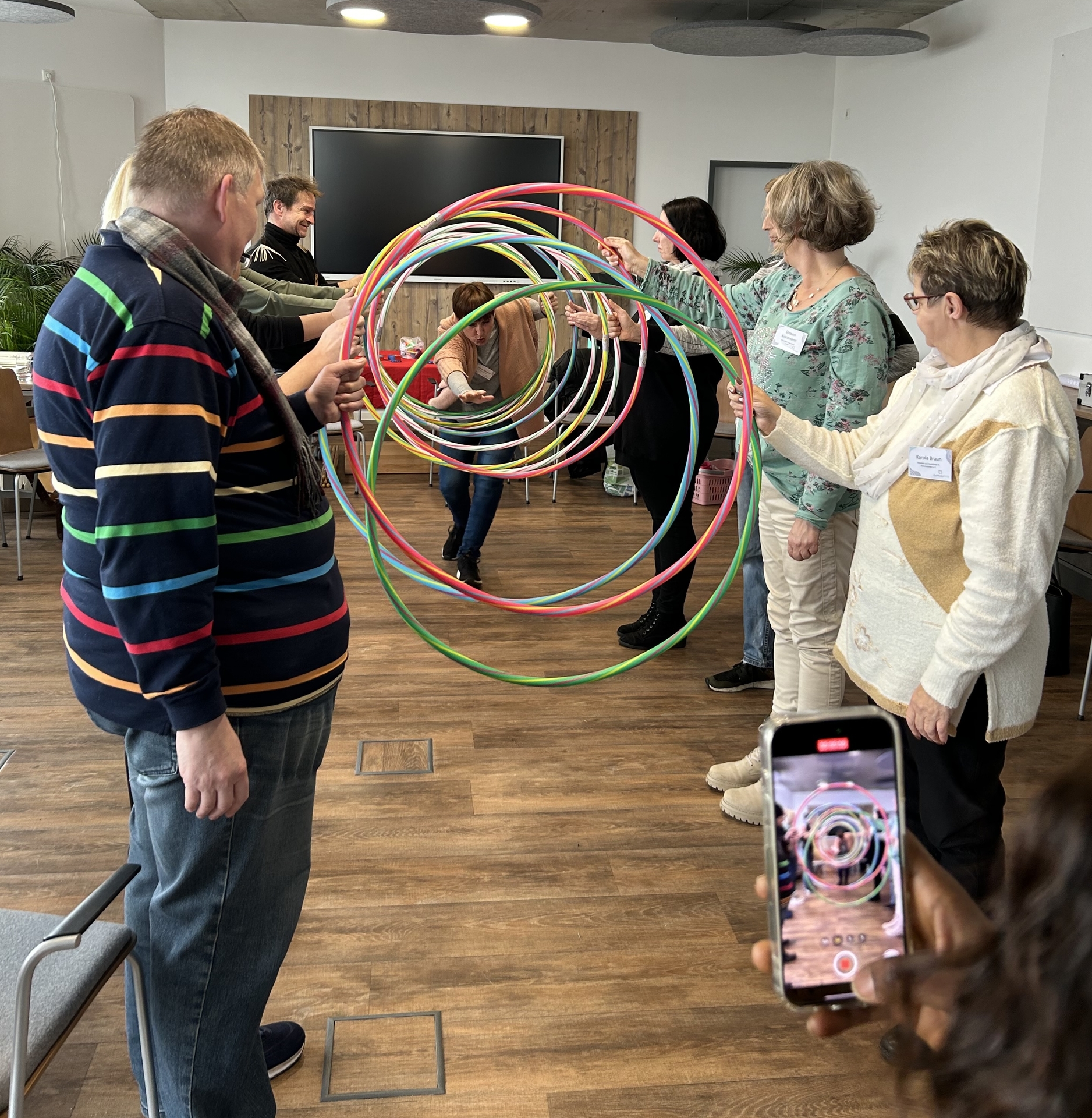 Am 5. Dezember 2023 fand die Fortbildung „Magische Momente aus dem Zirkuskoffer“ statt, welches vom Duo equilibre aus Berlin konzipiert und durchgeführt wurde. Katja Echterbecker und Stephan Kleinknecht haben den Teilnehmenden Bewegungsübungen aus dem Zirkus- und Artistikbereich beigebracht, damit sie zukünftig mit diesem Handwerkszeug in den Familien mit Pflegebedürftigen oder in Pflegeeinrichtungen arbeiten können. Die Fortbildung wurde aus Mitteln der Pflegekasse finanziert.