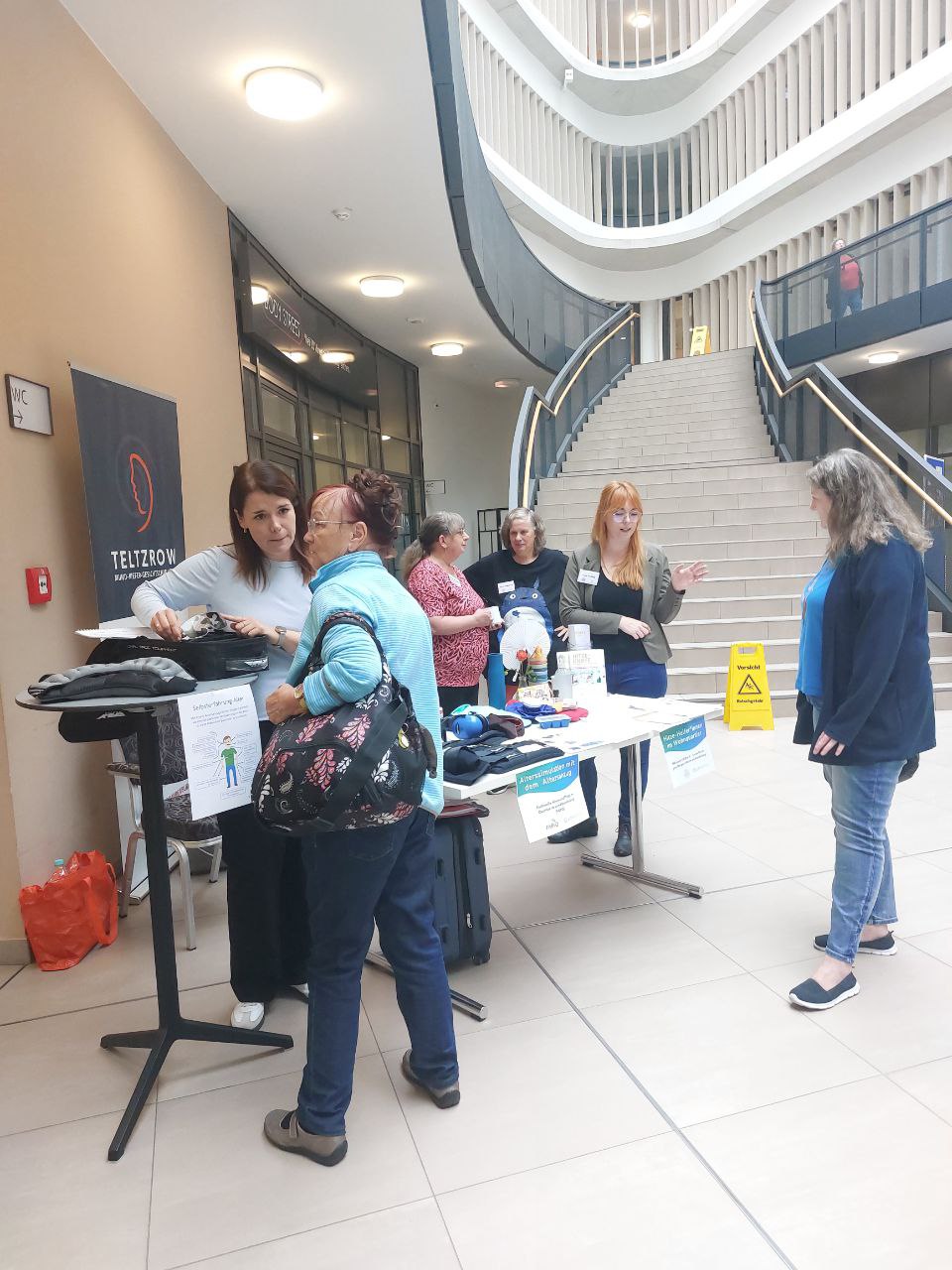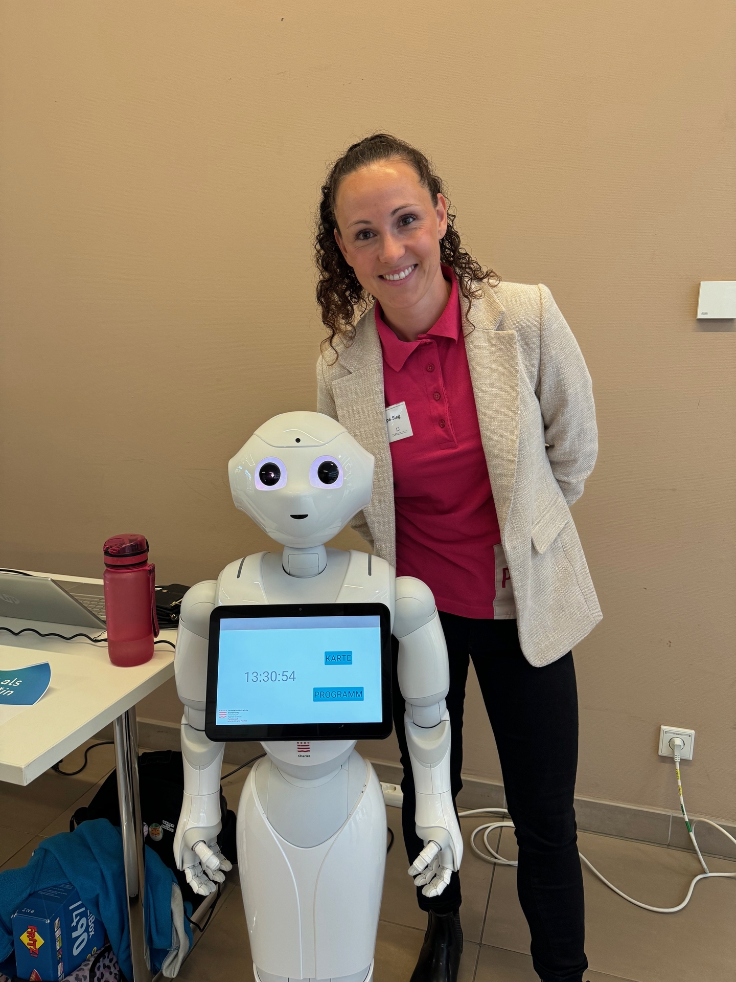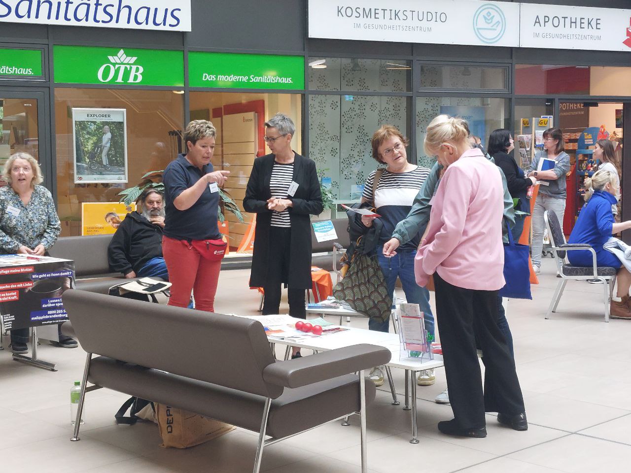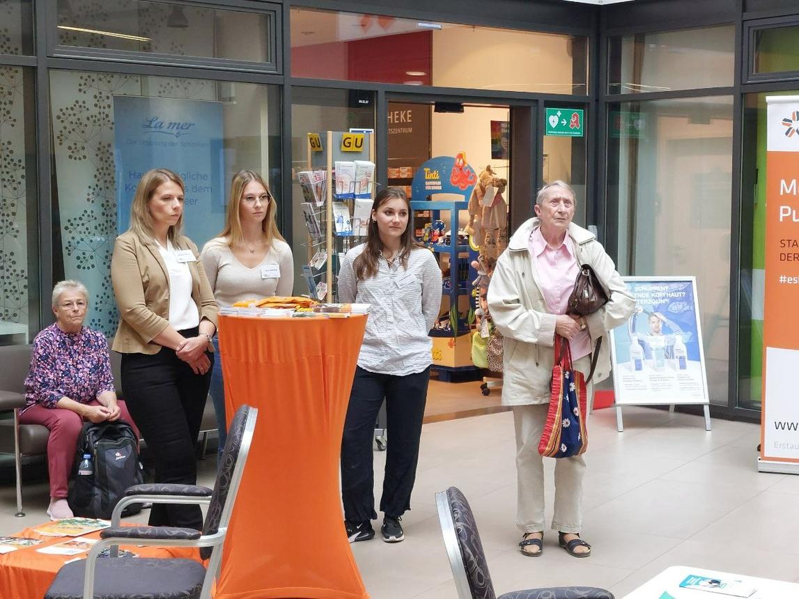 Im Atrium des Gesundheitszentrums gab es zahlreiche interaktive Stationen, an denen die Besucher*innen in den direkten Austausch mit Fachleuten treten konnten. Hier stellten regionale Pflegeeinrichtungen ihre Angebote vor und luden zu Gesprächen über pflegerische Herausforderungen und Lösungen ein. Höhepunkte waren die Präsentation innovativer Pflege-Technologien, darunter ein Roboter, der als Arzthelfer eingesetzt werden kann, Aufklärung zu Notruflösungen, das Ausfüllen von Vorsorgevollmachten und der Einsatz eines Altersanzugs, der es den Teilnehmer*innen ermöglichte, sich in die Lebenswelt älterer Menschen hineinzuversetzen. „Die Vielfalt der Pflegeangebote in Brandenburg war beeindruckend. Wir konnten wertvolle Einblicke gewinnen und viele neue Kontakte knüpfen“, berichtete eine Teilnehmerin.