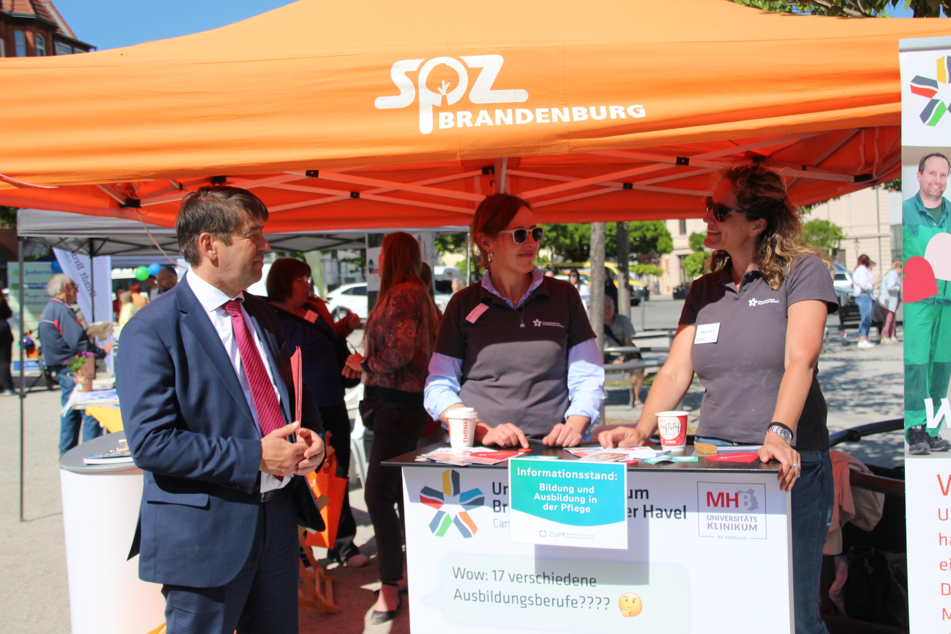 Das Netzwerk Zukunft Pflege in Brandenburg an der Havel (ZuPf) hat am 11. September 2024 einen Fachtag ausgerichtet, bei dem nicht nur die Pflegelandschaft der Stadt präsentiert wurde, sondern auch Aufklärungsarbeit zu Pflegethemen stattfand. Der gut besuchte Tag bot einen Aktionsbereich mit zahlreichen Ständen, zwei spannende Vorträge und eine Podiumsdiskussion zum Thema „Die Pflege in 2035 – Wie pflegen wir morgen?“.