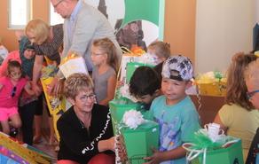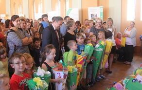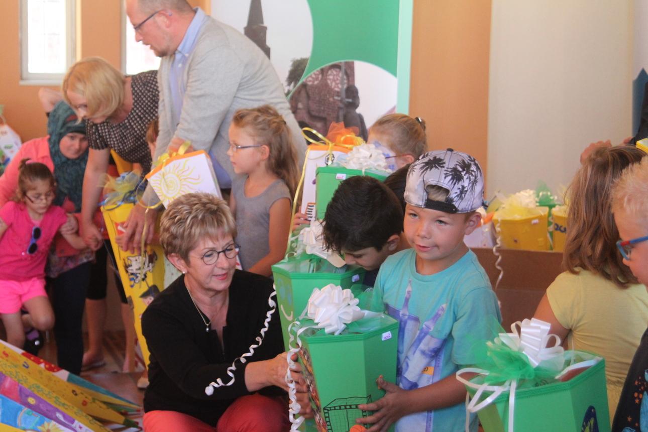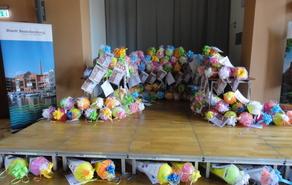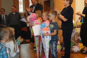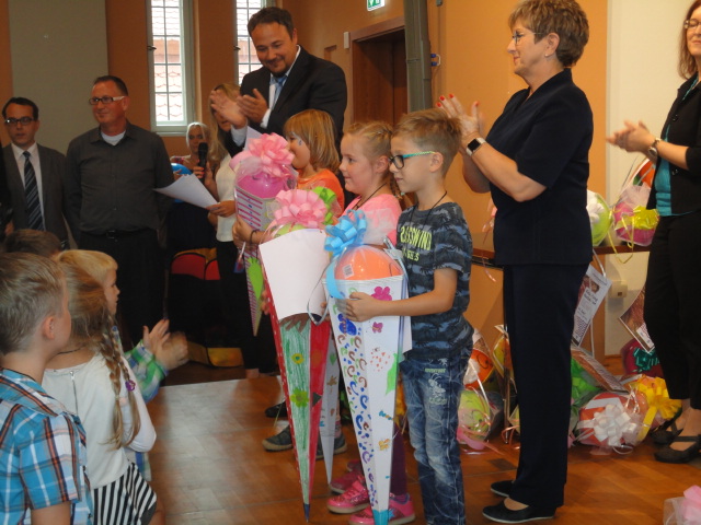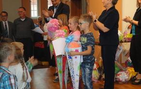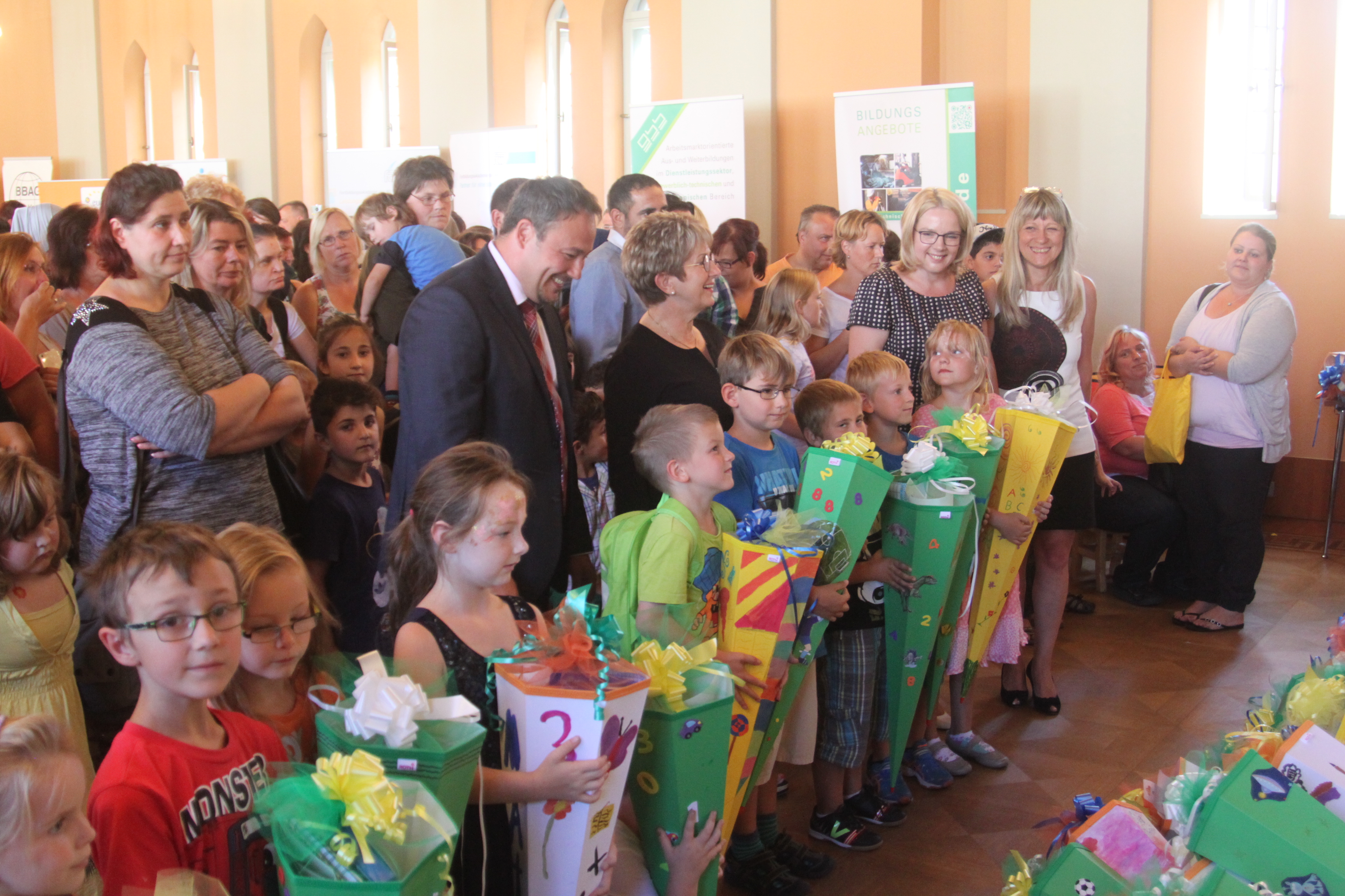Beim integrierten Schultütenfest übergaben Oberbürgermeisterin Dr. Dietlind Tiemann und die Beauftragten an rund 100 zukünftige Schüler eine befüllte Schultüte zur Einschulung. Die Schultüten wurden von Kindern der Evangelischen Grundschule liebevoll gebastelt.