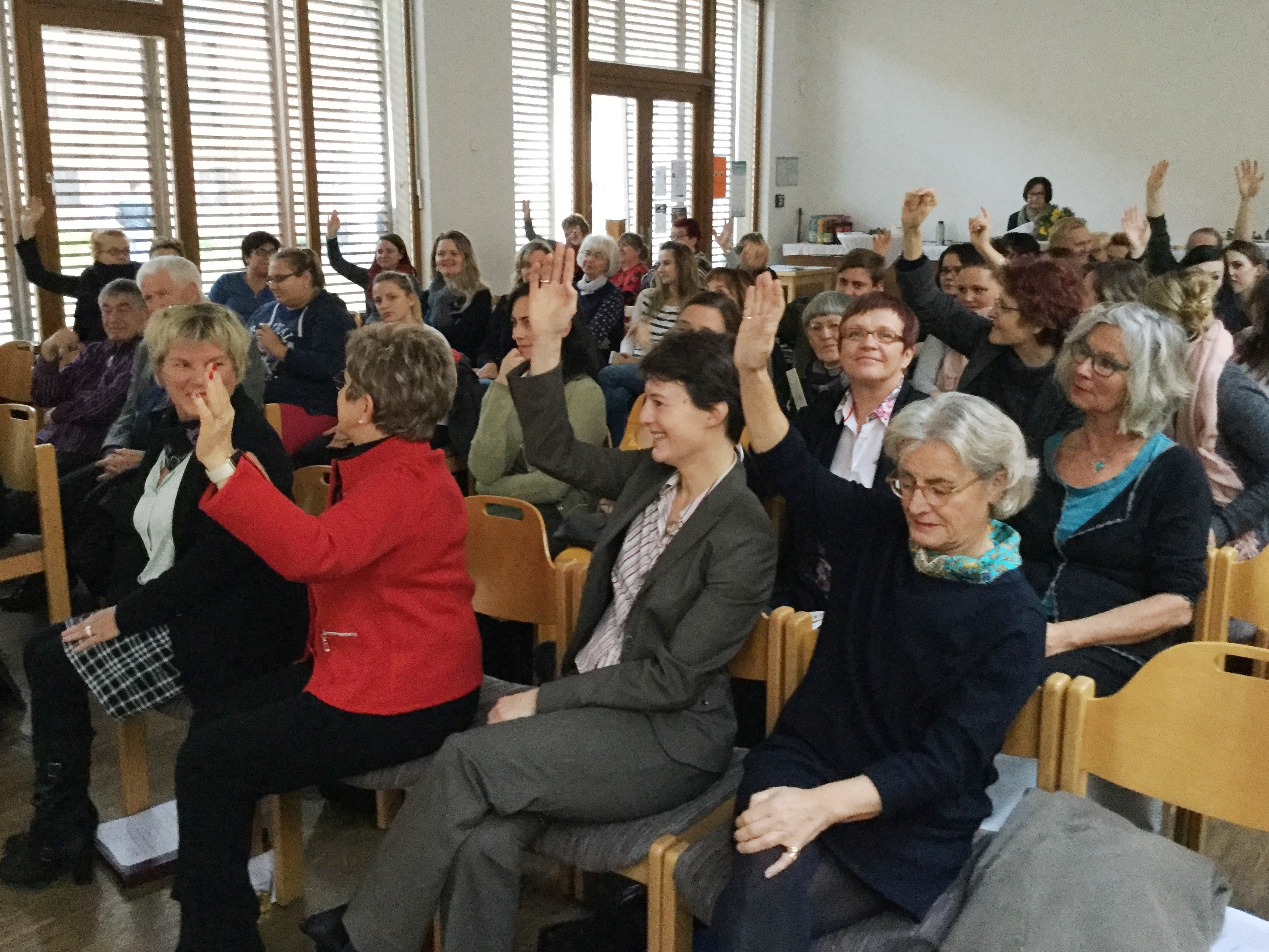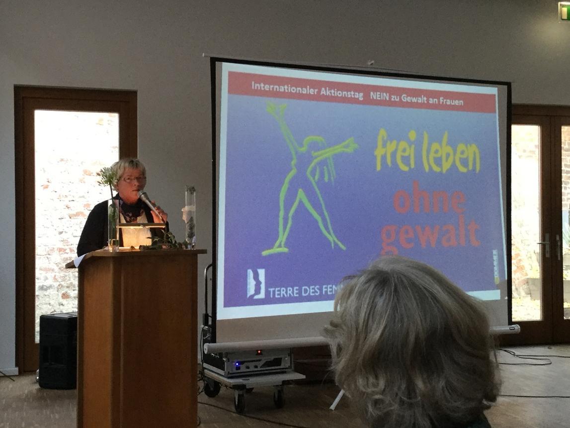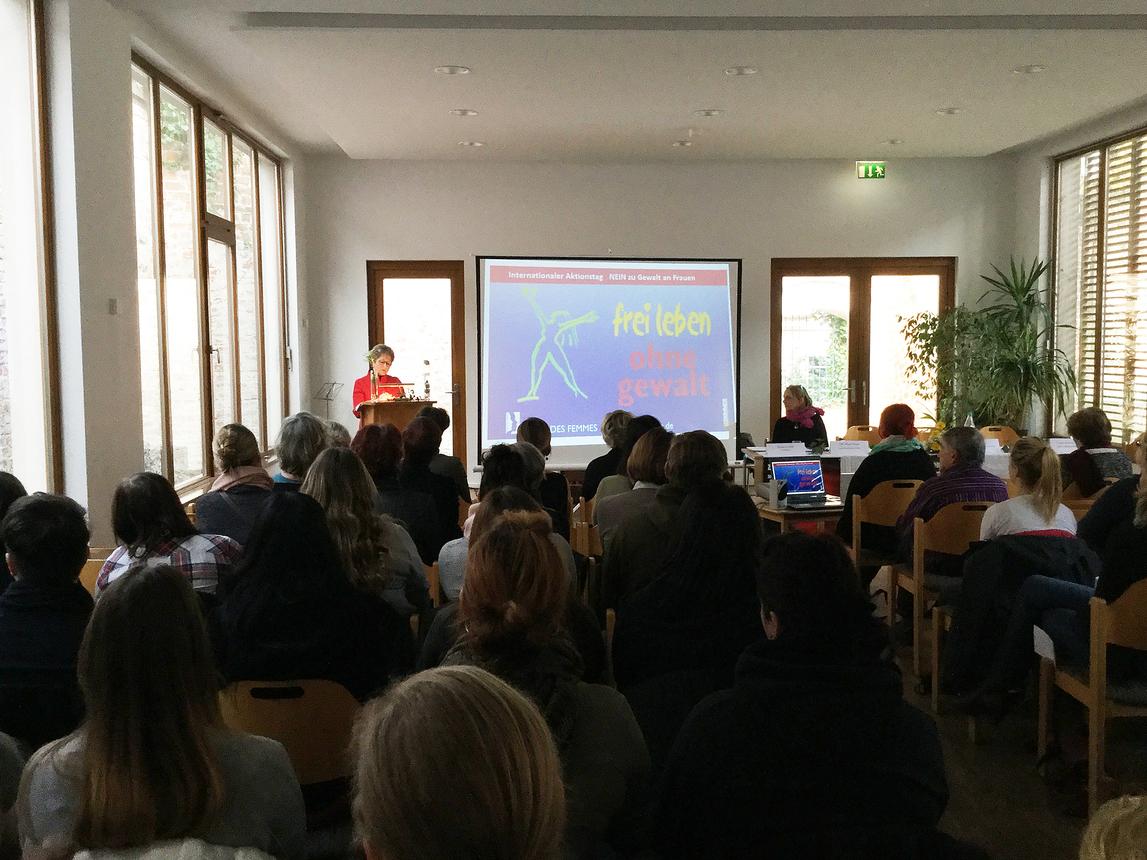Nach der Begrüßung durch Kornelia Köppe, dem Grußwort der Oberbürgermeisterin und einer Rede der Landesgleichstellungsbeauftragten Monika von der Lippe berichteten Faith Wagaki Ndege, Grundschullehrerin aus Kenia, sowie die Chilenin Alicia Garay Garate über Schicksale und Fluchterfahrungen von Frauen.