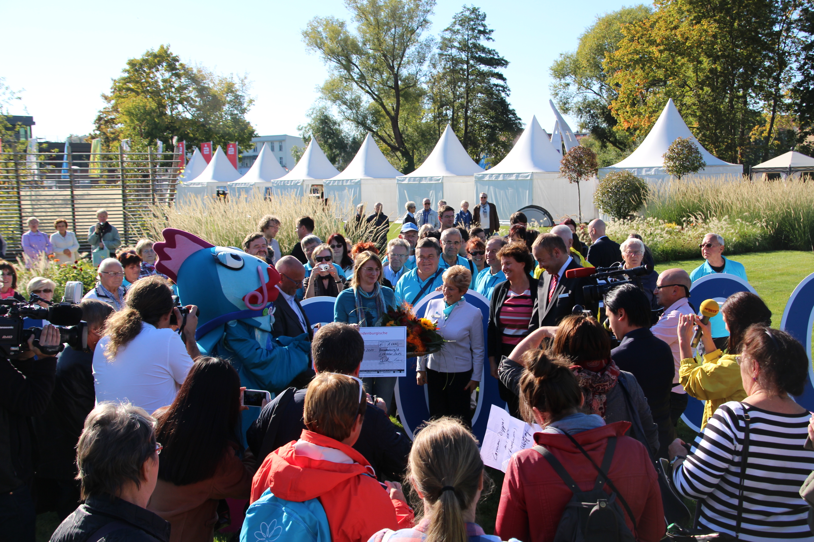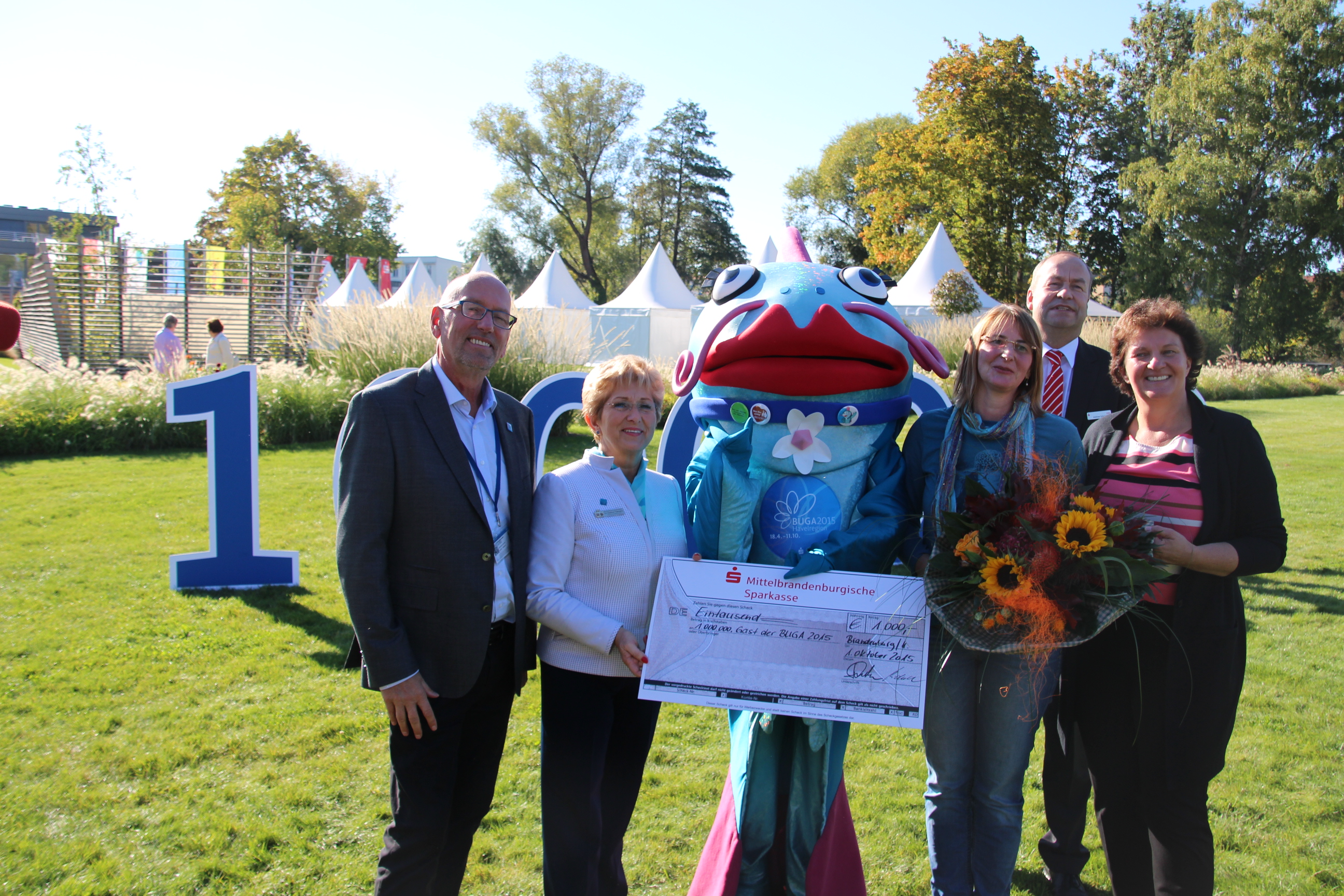 Am, Donnerstag, 1. Oktober 2015, begrüßten Landtagspräsidentin Britta Stark und BUGA Zweckverbandsvorsitzende und Oberbürgermeisterin Dr. Dietlind Tiemann die millionste Besucherin, Carmen Dippel aus Mettmann (Nordrhein-Westfalen) auf dem BUGA-Areal Packhof in Brandenburg an der Havel.