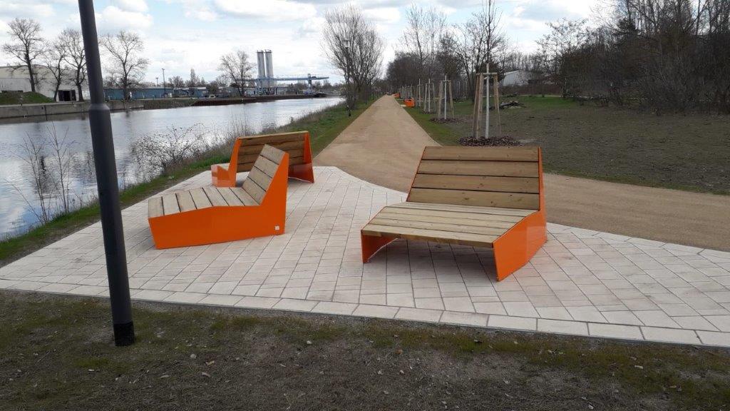 Spielgeräte für Kinder und Jugendliche unterschiedlicher Altersgruppen sowie Fitnessgeräte, die auch von Erwachsenen genutzt werden sollen, schaffen interessante Angebote für Sport und Spiel. Bänke, Liegemöbel an einem besonders exponierten Platz am Kanal sowie ein Picknickplatz am Kinderspielplatz laden aber auch zum Verweilen ein.