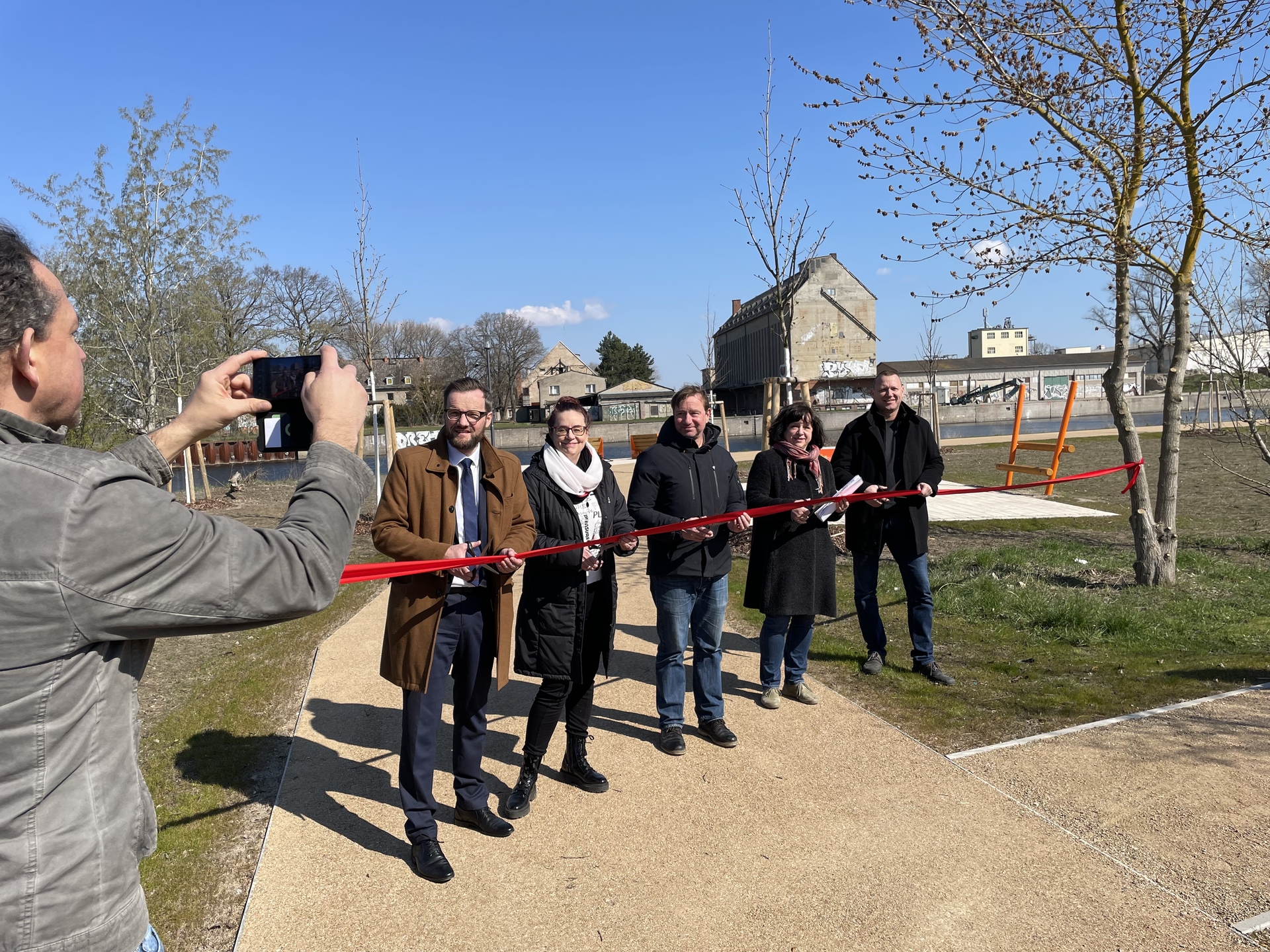 Der 1. Bauabschnitt des neuen Grünzugs am Silokanal zwischen der Eisenbahnbrücke und der Erweiterungsfläche der Stadtmarina wurde heute feierlich durch den Bürgermeister Michael Müller und weiteren Beteiligten wieder für die Öffentlichkeit freigegeben.