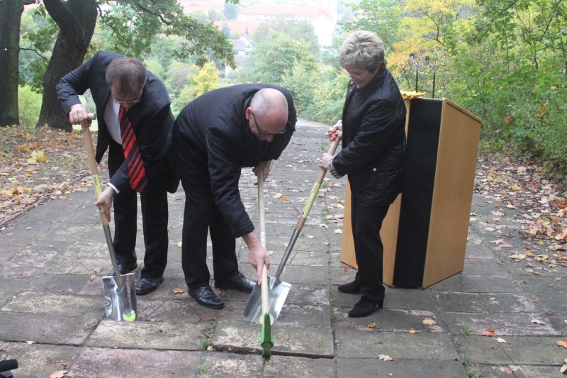 Gemeinsam mit Infrastrukturminister Jörg Vogelsänger hat Oberbürgermeisterin Dr. Dietlind Tiemann am 15.10.2012 den symbolischen 1. Spatenstich für die Sanierung des Marienberges am Nordaufgang vollzogen.