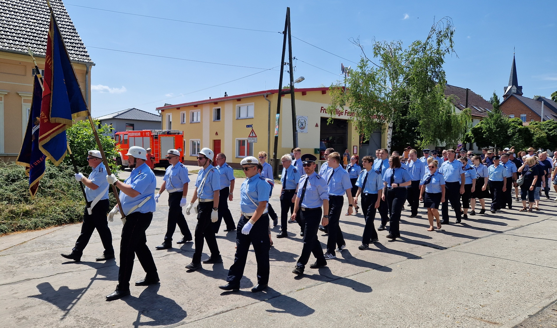 Erinnert wurde in dem festlichen Schmerzker Rahmen auch an die Anfänge unter Wehrleiter Fritz Neuendorf, an die von Pferden gezogene Handpumpe, deren Nachfolger 1936 eine vollgummibereifte Motorspritze (TS6) wurde. Ebenso wurde der Gründung der Frauengruppe 1972, dem Bau des Gerätehauses 1980 und der Gründung der Kinder- und Jugendgruppe 1992 gedacht sowie dem Jahr 1998, als die Wehr zwei neue Fahrzeuge – einen Mannschaftswagen und ein Kleintanklöschfahrzeug – auf einen Schlag erhielt. Es sollten 26 Jahre vergehen, bis zur nächsten technischen Revolution: Bei der Jubiläumsfeier im Festzelt wurde der gut 100 Mann und Frau starken Wehr das besagte LF10 als neues Einsatzfahrzeug übergeben. Das führte sodann am Samstag den großen Festumzug durch den Ort an, woran sich ein buntes Familienfest mit befreundeten Wehren anschloss. Auf dem Festplatz sorgten Preiskegeln, Bierrutsche, Kinderschminken, Hüpfburg, Fahrgeschäfte und Vorführungen der Schmerzker Kameradinnen und Kameraden für Kurzweil, abends gab „Tor 11“ den Ton im Festzelt an. Sonntag folgten der Festgottesdienst mit Segnung des neuen Einsatzfahrzeugs sowie ein zünftiger Frühschoppen.