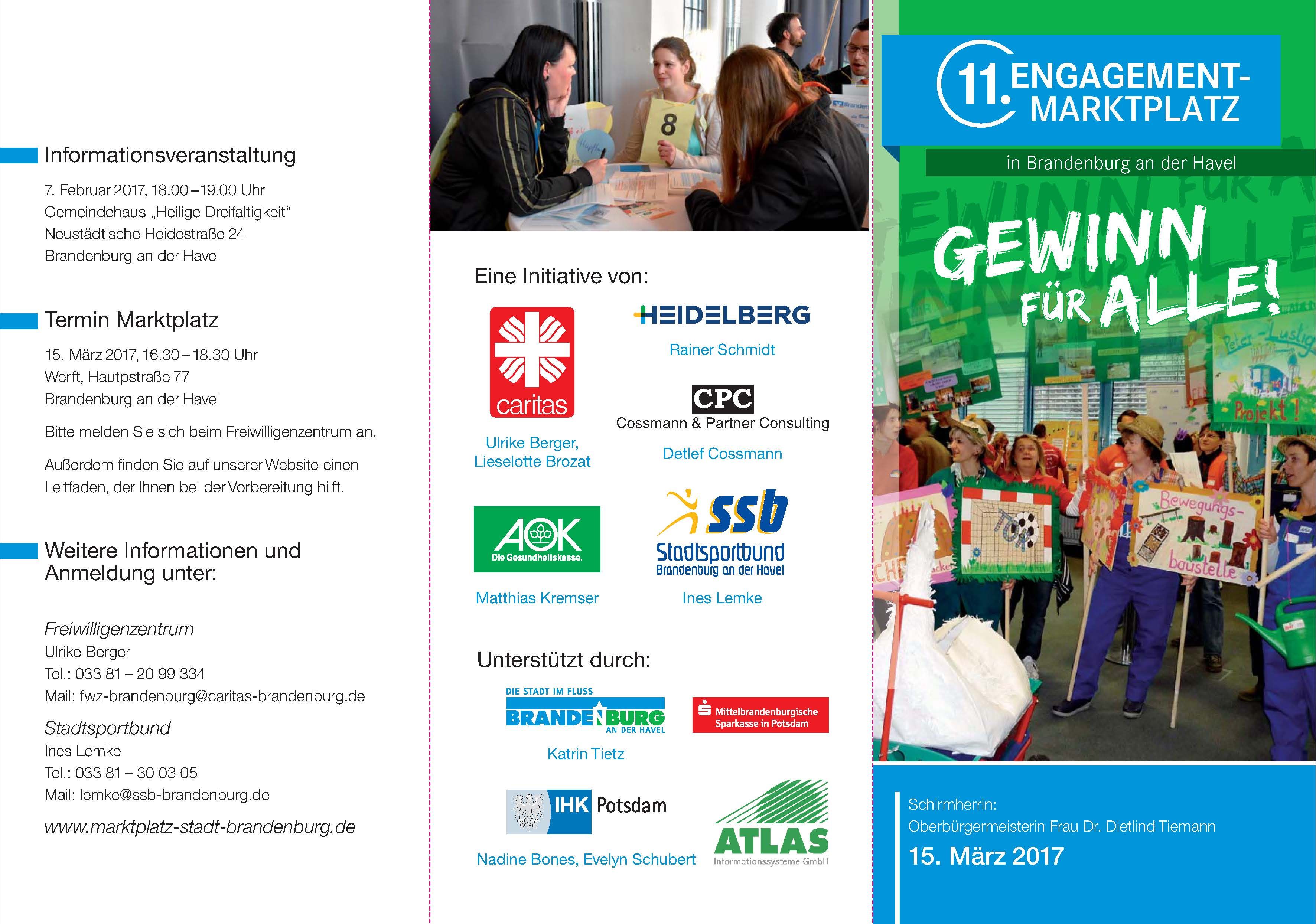 Unter der Schirmherrschaft von Oberbürgermeisterin Dr. Dietlind Tiemann findet am 15. März 2017, in der Zeit von 16:30 – 18:30 Uhr, in der WERFT, Hauptstraße 77, der bereits 11. Engagement-Marktplatz unter dem Motto „Gewinn für alle“ in Brandenburg an der Havel statt.
