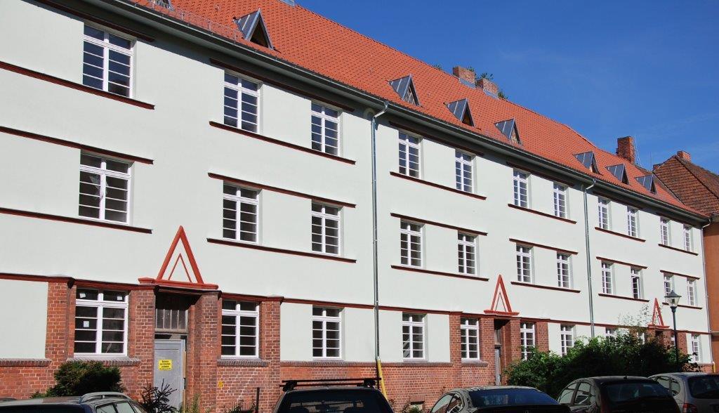 Die Goethestraße 8b gehört zu einer um 1925/30 in der Goethe-, Havel- und Schillerstraße errichteten Blockrandbebauung in expressionistischen Formen. Die dreigeschossigen Putzbauten mit Satteldach sind durch Ziegel- und Putzgliederungen, Dreiecksblenden über den Türen und dreieckige Dachgauben gestaltet. Nach längerem Leerstand begann 2017 die Sanierung und Modernisierung der Goethestraße 7, 8, 8a und 8b als Mietwohnungen. Der baubegleitende Brandenburger Architekt Karsten Spangenberg erläutert am Beispiel der Goethestraße 8b das Sanierungsgeschehen.
