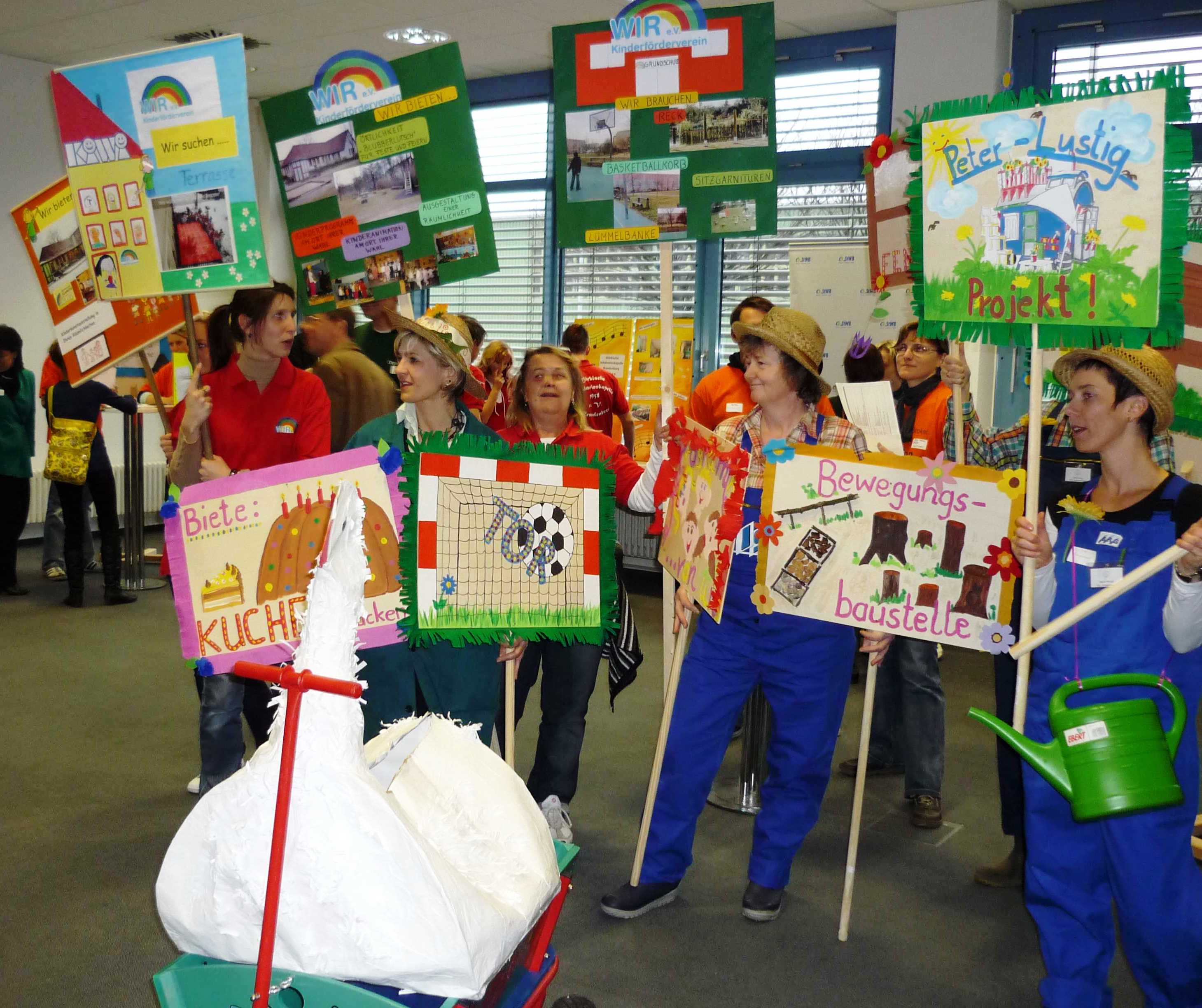 Auszubildende eines Unternehmens unterstützen eine gemeinnützige Einrichtung bei der Durchführung einer Sportveranstaltung für Kinder und erhalten dafür Übungsstunden für den gesunden Rücken; eine Behinderteneinrichtung gestaltet das Schaufenster einer Apotheke und erhält im Gegenzug einen Vortrag.