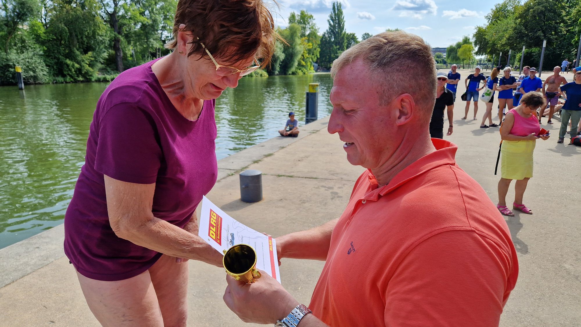 Sie alle wurden abschließend bei der Siegehrung mit Urkunden und Pokalen – übergeben vom Beigeordneten Thomas Barz und der mitgeschwommenen Landtagsabgeordneten Britta Kornmesser – ausgezeichnet, wie auch die jüngsten und ältesten Teilnehmenden öffentlich geehrt wurden: bei den Starterinnen Monika Golldack (79) und Klara Schwarzlose (7) sowie bei den „Männern“ Fritz Müller (73). Die stärkste Teilnehmergruppe hatte einmal mehr die Lebenshilfe Brandenburg entsendet, von der Dennis Harms – begleitet von Kai Uwe Ewald und Matthias Pietschmann – stolz als Letzter aus dem Wasser auf den Zielsteg stieg.