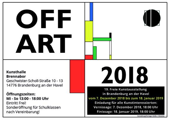 Die OFF ART lebt. Und wie! 2018 wird die renommierteste und traditionsreichste „Freie Kunstausstellung“ des Landes zum 19. Mal und wie gewohnt juryfrei stattfinden. In diesem Jahr steht die OFF ART erstmals unter einer thematischen Überschrift: StadtLandschaften Brandenburg an der Havel. Die Werke aller teilnehmenden Künstlerinnen und Künstler weisen auffällige wie verborgene, verträumte wie realistische Bezüge zur Stadt auf. Bilder, Grafiken, Plastiken, Fotografien bezeugen die Vielfalt der hier erlebten und erspürten Innen- und Außenwelten. Die individuellen künstlerischen Handschriften der über 40 KünstlerInnen sind abstrakten oder realistischen, impressionistischen oder expressionistischen Kunststilen verpflichtet. Farbenfrohe Schlaglichter werden geworfen, monochrome Geschichten erzählt. Sie sind herzlich eingeladen, sich dem Zauber und den Harmonien der fast 90 Werke auszusetzen. Wir freuen uns auf Ihr Kommen und garantieren Ihnen faszinierende, neu und ganz anders interpretierte urbane Welten.
