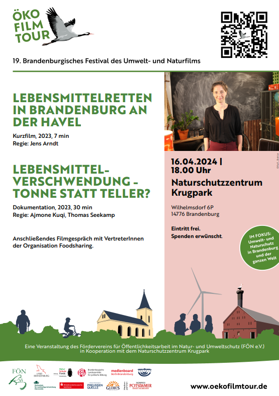 Im Rahmen des Filmfestivals "Ökofilmtour" wird im Naturschutzzentrum Krugpark am Dienstag, dem 16. April 2024, um 18:00 Uhr in der Umweltpyramide der 7-minütige Kurzfilm „Lebensmittelretten in Brandenburg an der Havel“ (2023) von Jens Arndt, gezeigt.