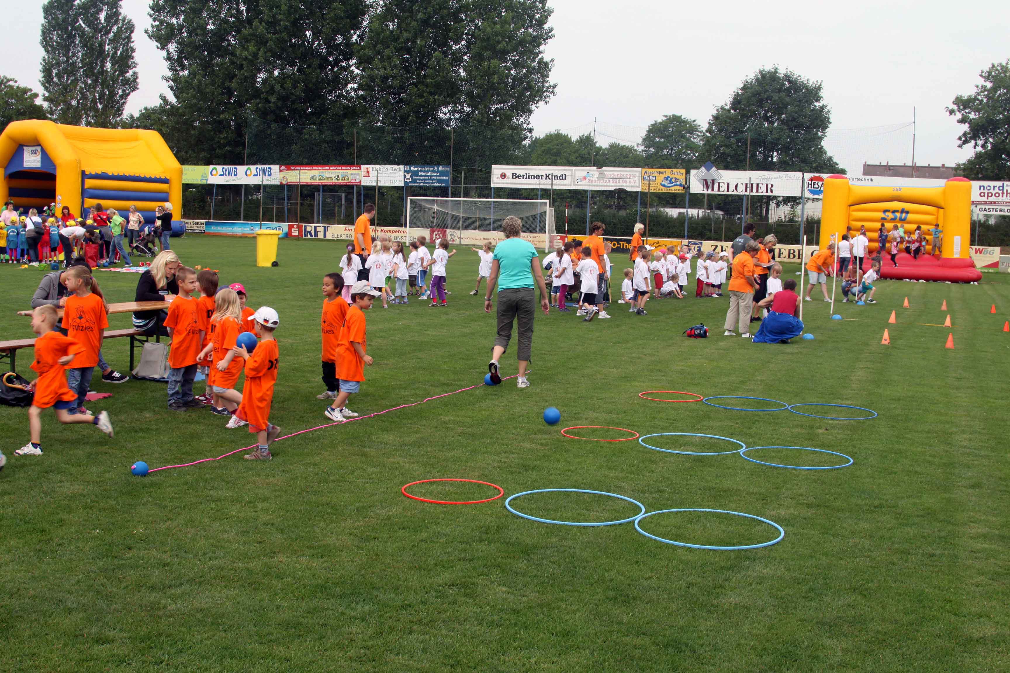 Oberbürgermeisterin Dr. Dietlind Tiemann begrüßte im Stadion des BSC Süd 05 e.V. die rund 450 Kinder. In den Übungen Schlängellauf, Ballzielwurf, Seilsprung und Rumpfbeugen konnten die Kinder aus insgesamt 19 Kindertagesstätten ihr Können unter Beweis stellen.