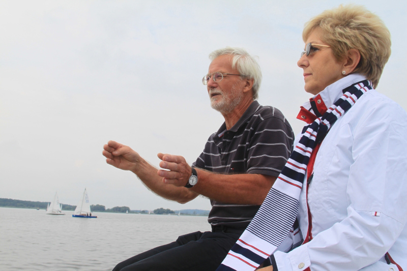 Oberbürgermeisterin Dr. Dietlind Tiemann ließ sich von Hartmut Fenger die Wettkampfregeln auf dem Wasser erklären und feuerte die Seglerinnen und Segler an.