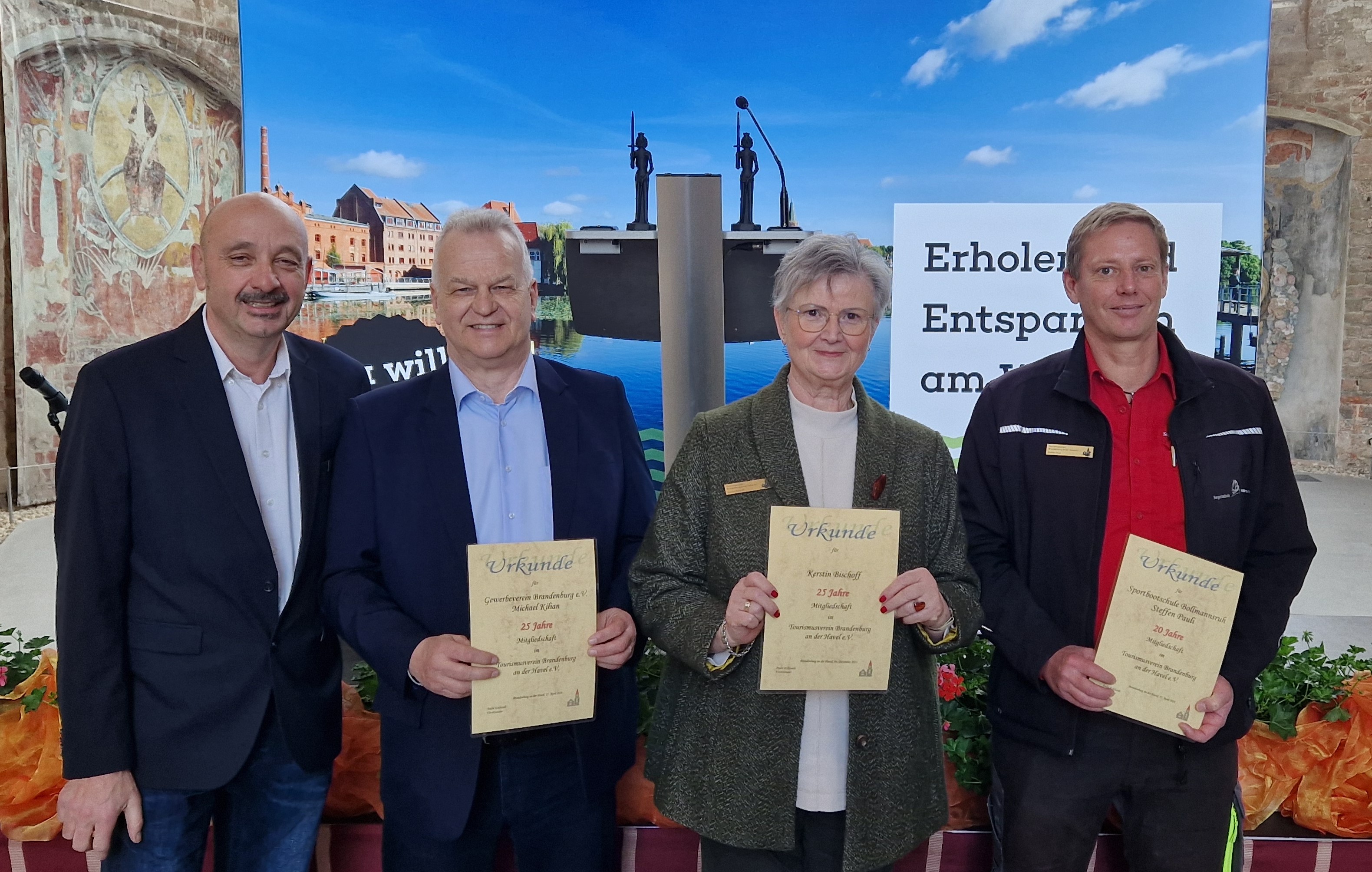 Den Auftakt übernahm André Eckhardt als Vorsitzender des Tourismusvereins, der die ersten Schlaglichter auf die bevorstehende Saison warf und Aufmerksamkeiten verteilte: Blümchen für STG-Chef Thomas Krüger, der tags zuvor seinen 60. Geburtstags feierte, und für Brandenburgs Integrationsbeauftragte Katrin Tietz, deren Geburtstag mit dem Frühschoppen einherging. Urkunden für langjährige Vereinsmitgliedschaften überreichte „Ecki“ an Steffen Pauli (20 Jahre; Sportbootschule Bollmannsruh) sowie für die 25-jährige Mitgliedschaft an Kerstin Bischoff und an Michael Kilian als Vertreter des Gewerbevereins Brandenburg.