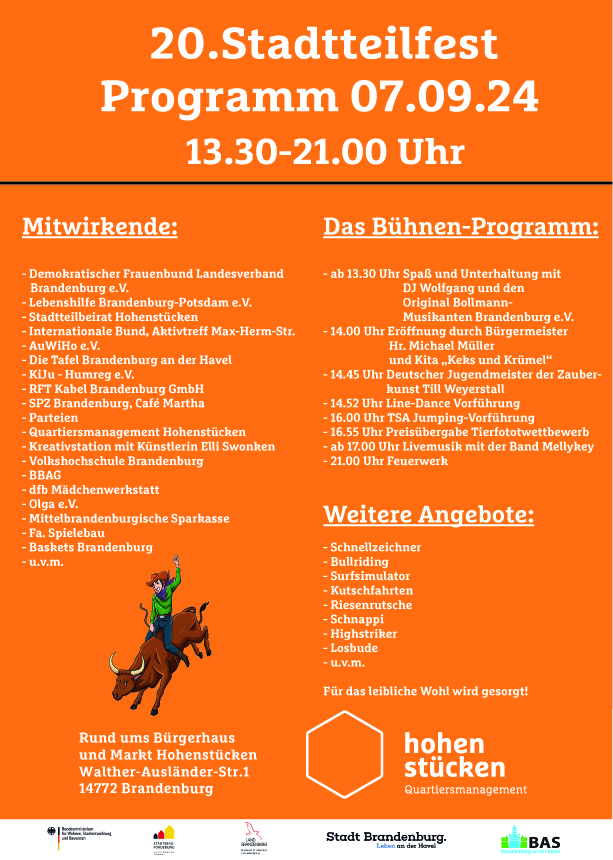 Am Samstag, 7. September 2024 wird im Stadtteil Hohenstücken rund ums Bürgerhaus und auf dem Marktplatz das bereits 20. Stadtteilfest & der 17. Geburtstag des Bürgerhauses gefeiert.