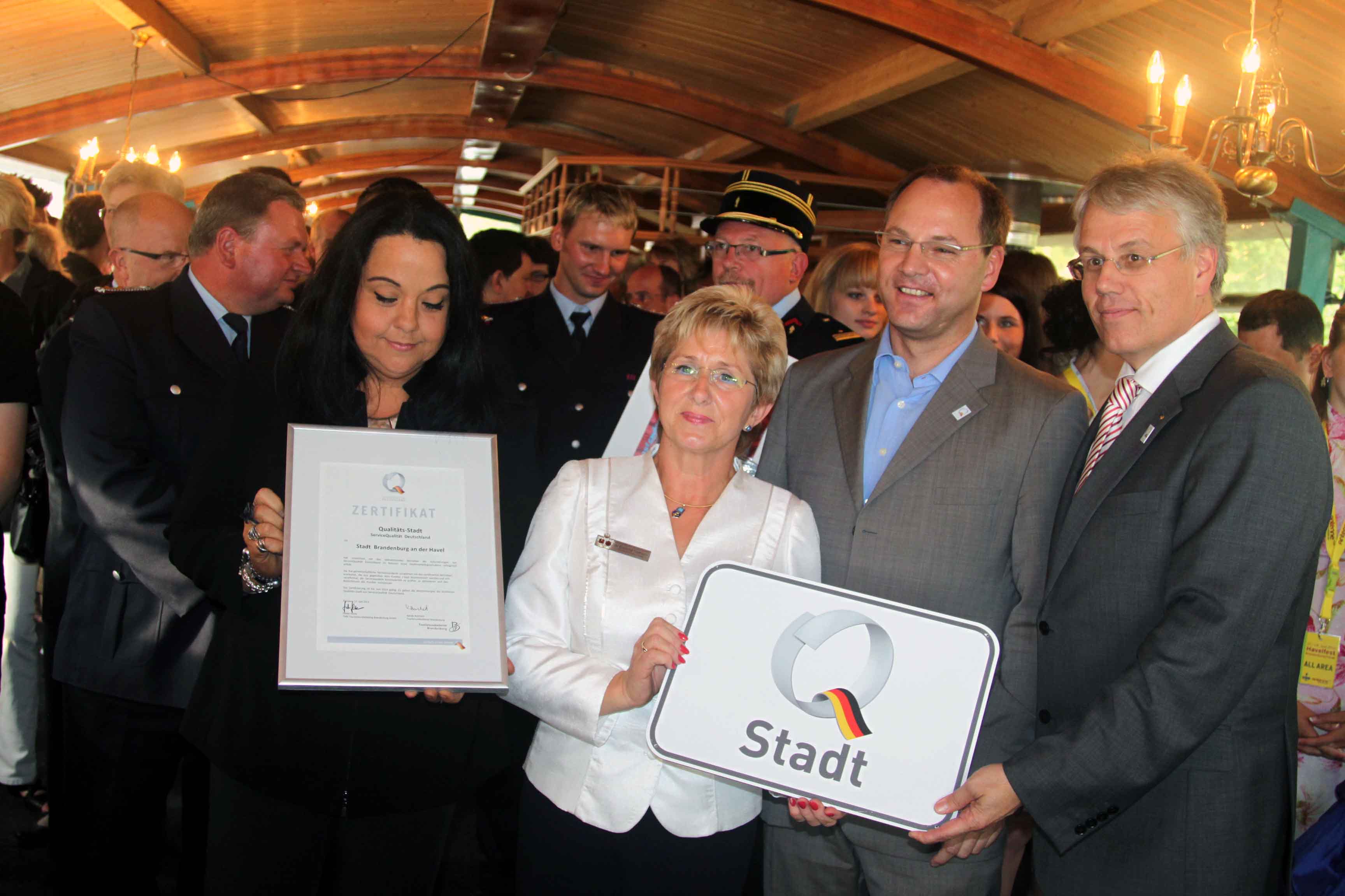 Im Rahmen des gemeinsamen Empfangs der Stadt Brandenburg an der Havel, des Gewerbevereins Brandenburg e.V. und der Städtischen Werke Brandenburg GmbH überreichte der Geschäftsführer der Tourismus Marketing Brandenburg GmbH Dieter Hütte das Qualitätssiegel „Qualitäts-Stadt“ an Oberbürgermeisterin Dr. Dietlind Tiemann.