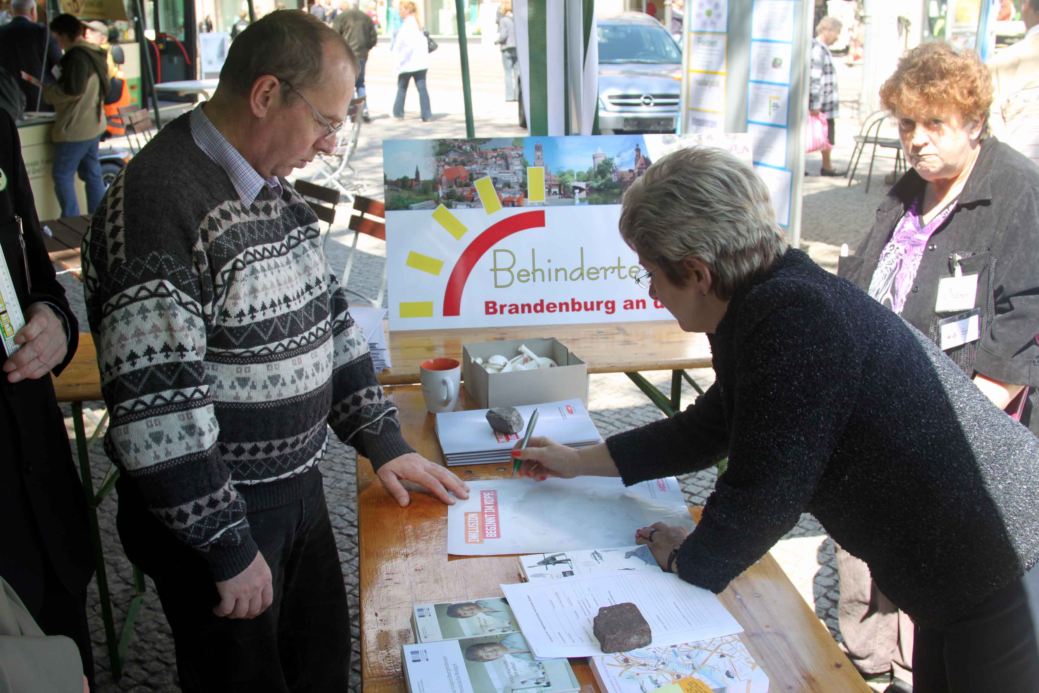 Anlässlich des Europäischen Protesttages der Menschen mit Behinderungen, am 5. Mai 2011, führten der Behindertenbeirat, die Kontaktstelle für Selbsthilfe der Caritas und die Stadt Brandenburg an der Havel gemeinsam an der Postsäule in der Hauptstraße eine Veranstaltung unter dem Motto „Inklusion beginnt im Kopf“ durch.