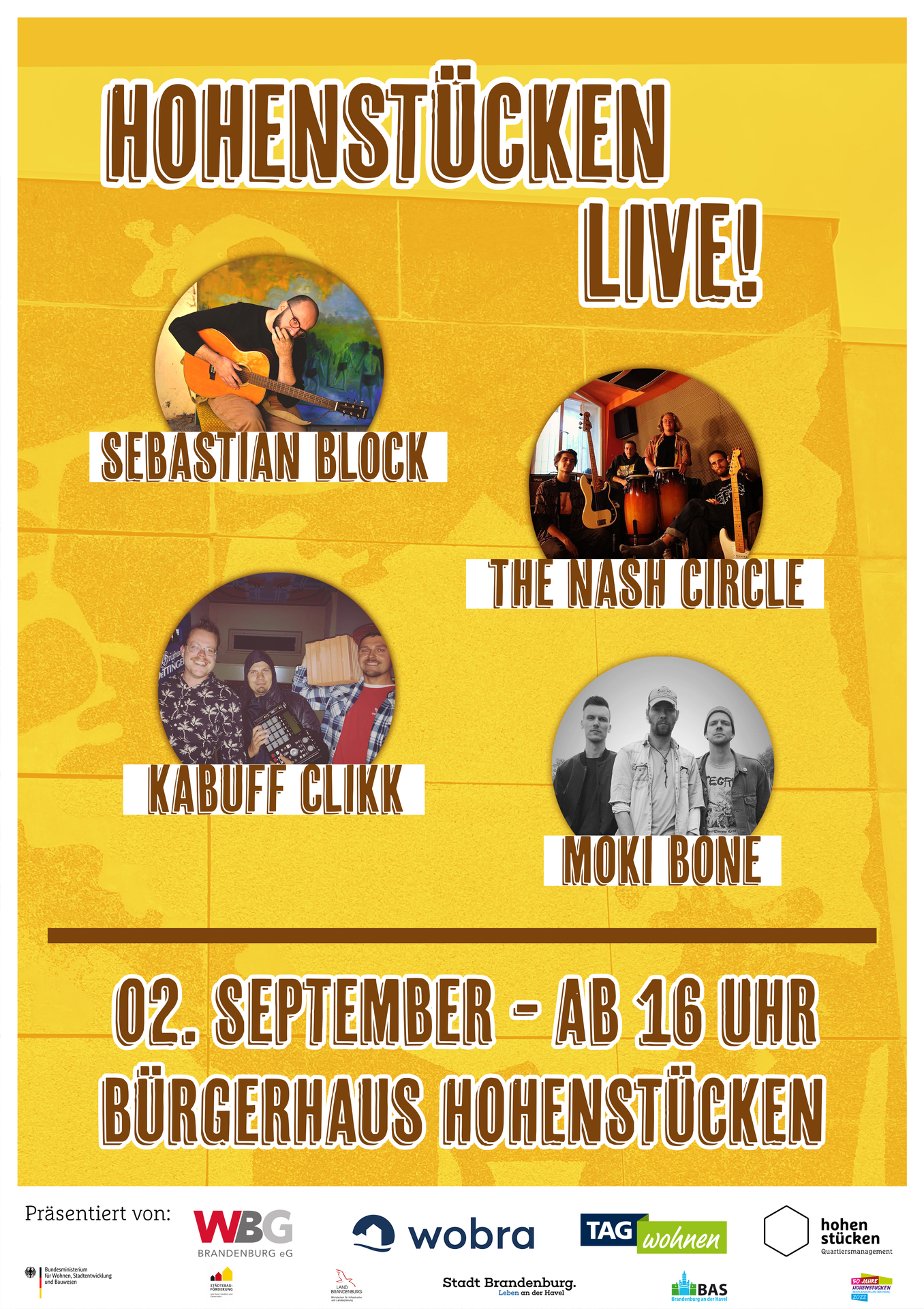 Am Freitag, dem 2. September, findet von 16:00 bis 21:00 Uhr erstmals ein lokales Musikfestival namens „Hohenstücken Live!“ statt. Mit Rockmusik von „The Nash Circle“ und „Moki Bone“ sowie Auftritten des Brandenburger Liedermachers Sebastian Block und den Rappern von „Kabuff Clikk“ ist auf dem Vorplatz des Bürgerhauses Hohenstücken für jeden Musikgeschmack etwas dabei.