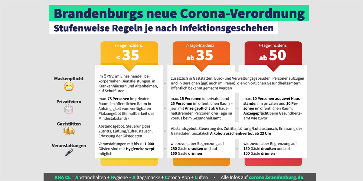 Damit treten die in der Umgangsverordnung des Landes festgelegten weiteren Einschränkungen in Kraft (Verordnung vom 20.10.2020, Kurzfassung siehe Grafik).