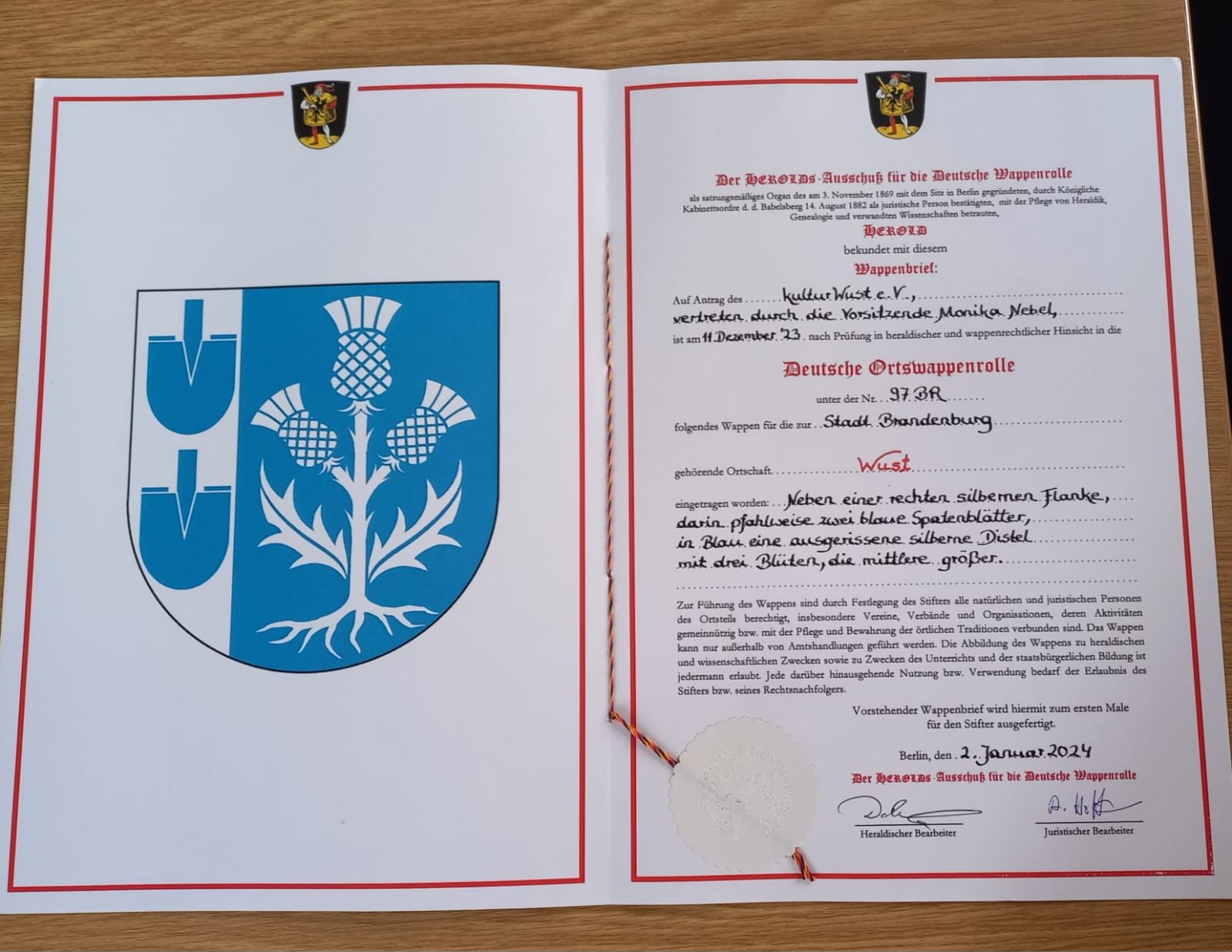 „Im Juni 2023 sprach mich die Vorsitzende des Vereins kulturWust e.V. an und bat mich um Unterstützung bei der Erstellung eines Ortsteilwappens für Wust. Ich war natürlich sehr erfreut und sagte sofort zu, da es mir ein Anliegen ist, die alte europäische Tradition des Wappenwesens lebendig zu halten.“