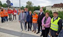 Zur offiziellen Baustellen-Begehung hatten sich neben Oberbürgermeister Steffen Scheller auch Bürgermeister Michael Müller, Stadtverordnetenvorsteher Walter Paaschen sowie Landtagsabgeordnete und Stadtverordnete auf der Brücke eingefunden.