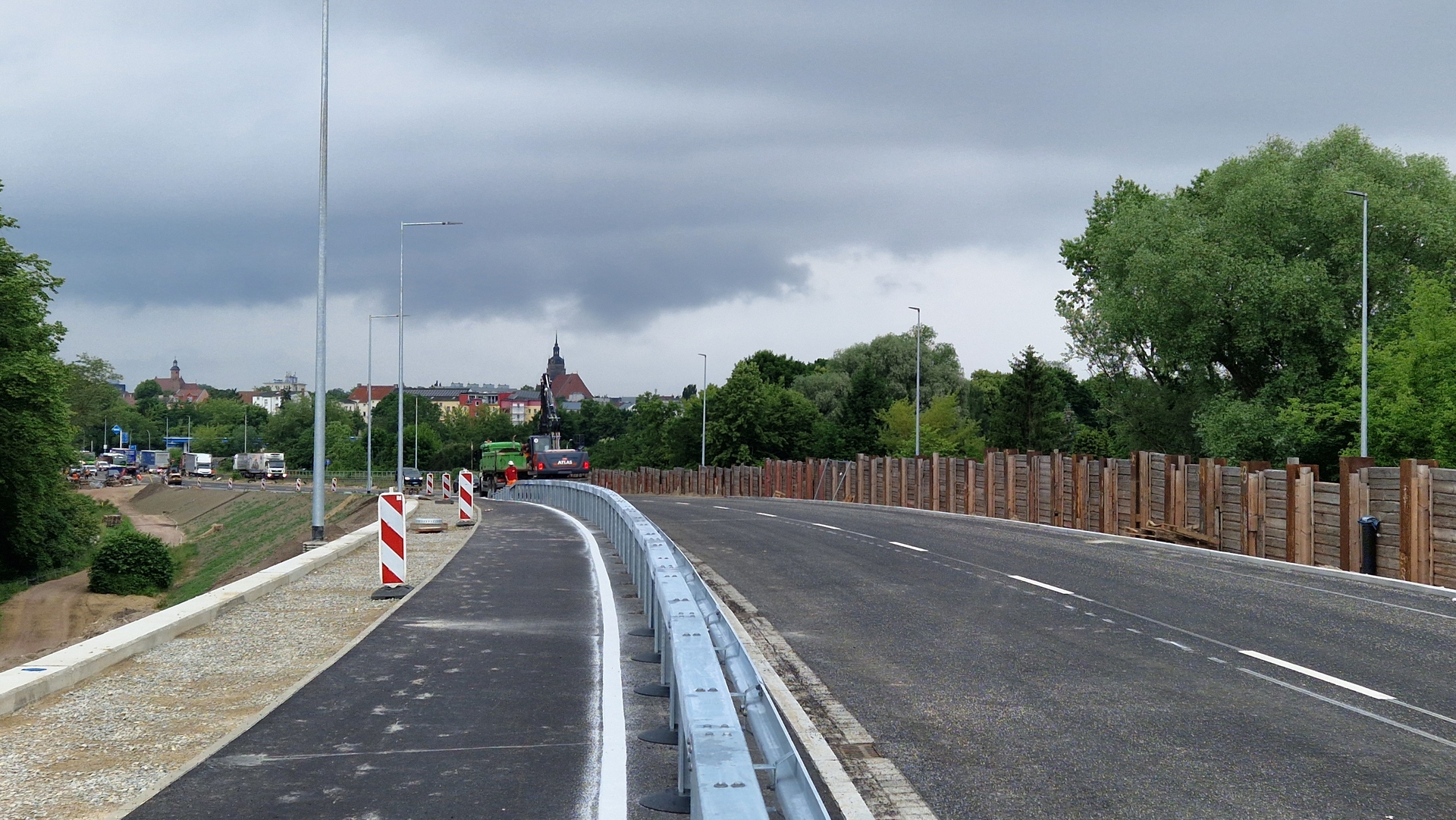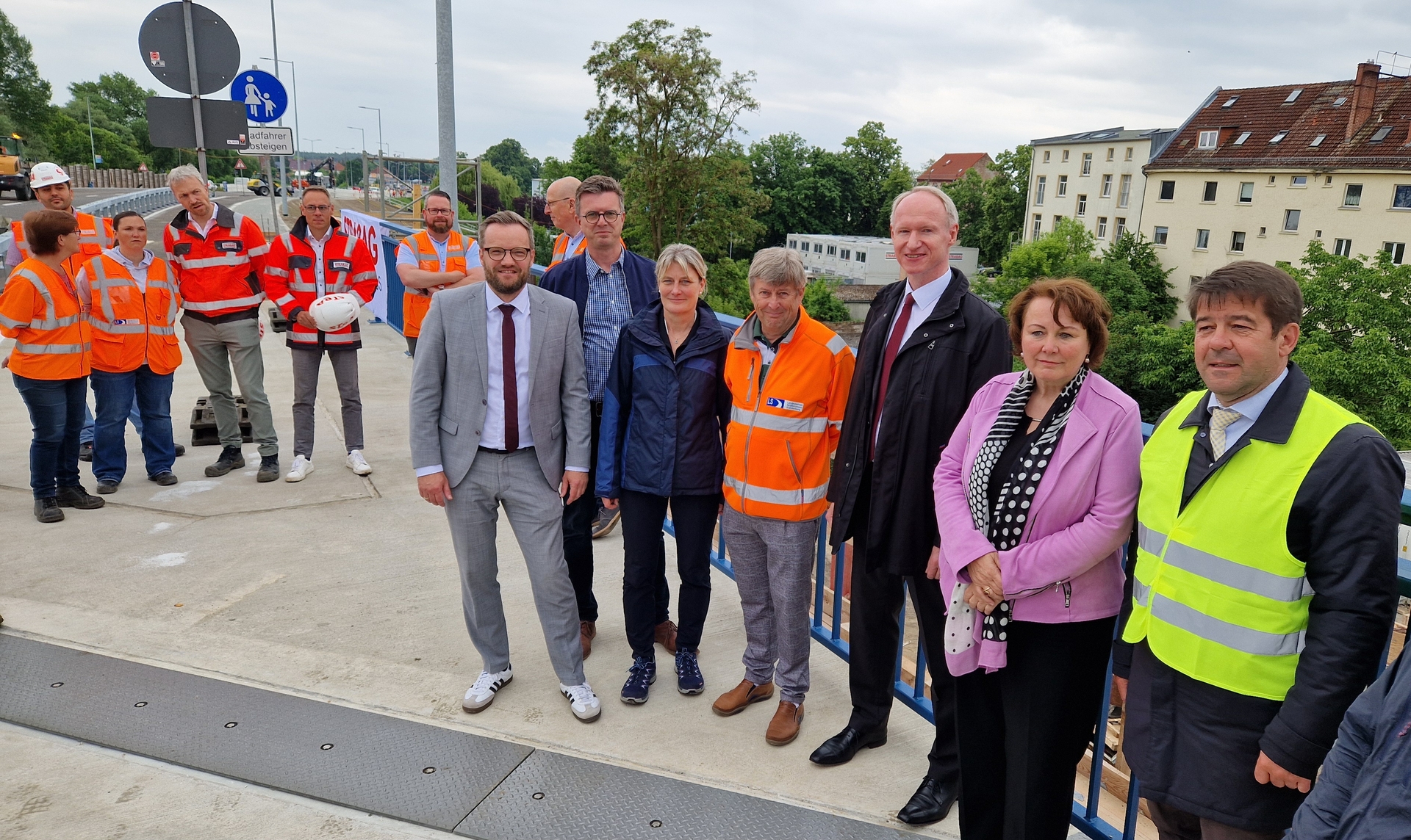 Das erste Teilbauwerk der Brücke über die Gleise der Deutschen Bahn AG im Zuge der Bundesstraße B 1 / Potsdamer Straße ist fertig gestellt, wie auch die zuführenden Straßen und die kleine Brücke über den Neujahrsgraben. Verkehrsstaatssekretärin Dr. Ina Bartmann informierte sich heute anlässlich der bevorstehenden Verschwenkung des Verkehrs vom alten auf das neue Bauwerk vor Ort. Der Verkehr soll ab morgen, im Laufe der Mittagsstunden, auf die erneuerte stadtauswärtige Fahrbahn geleitet werden.