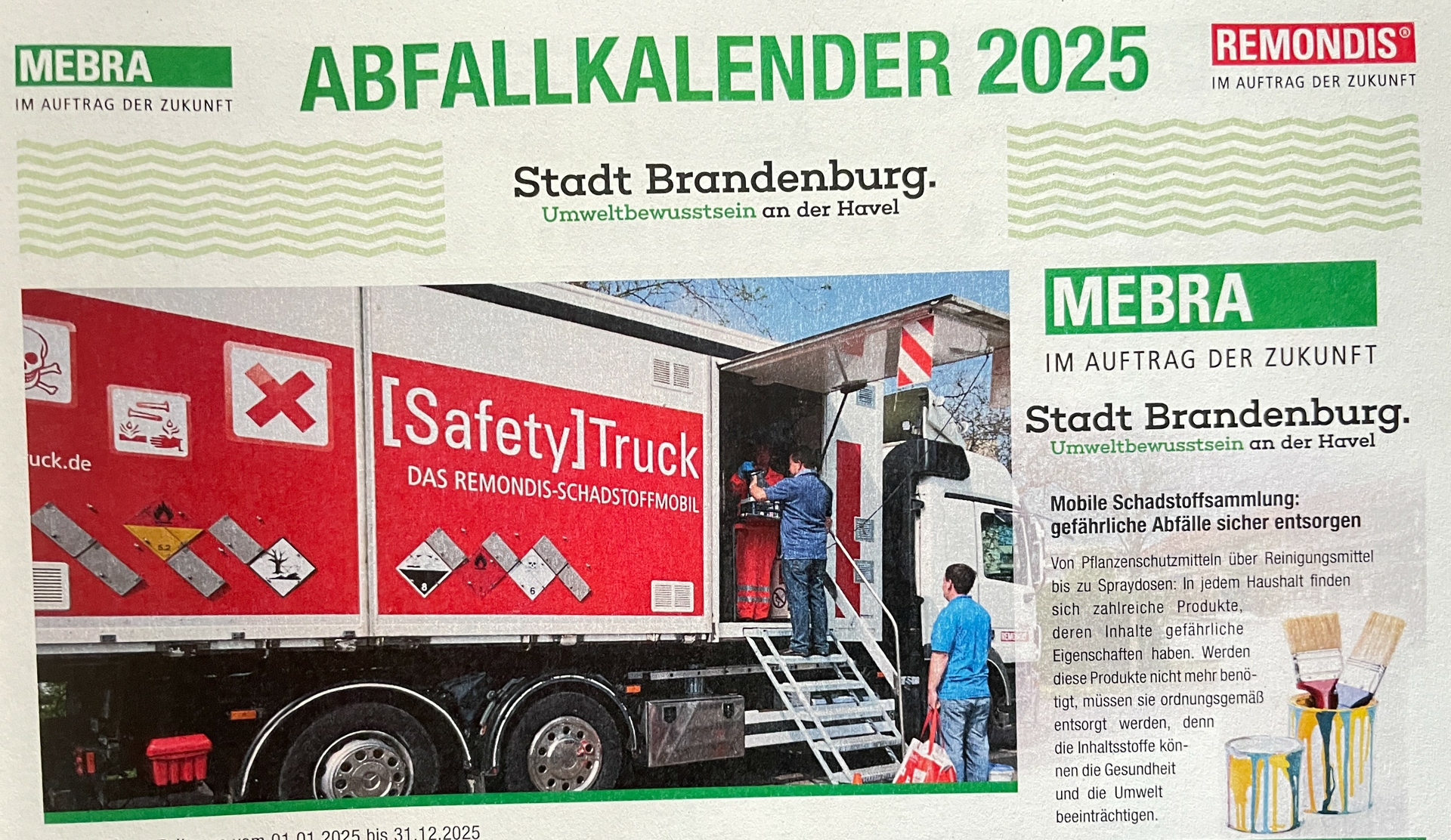 Abfuhrtermine zur Leerung der Restmülltonnen, Biotonnen sowie Papiertonnen verändern sich im Vergleich zum Jahr 2024 aufgrund von Befahrungseinschränkungen bei Brücken (Schleusenbrücke)Abfallkalender 2025 ist online abrufbar.