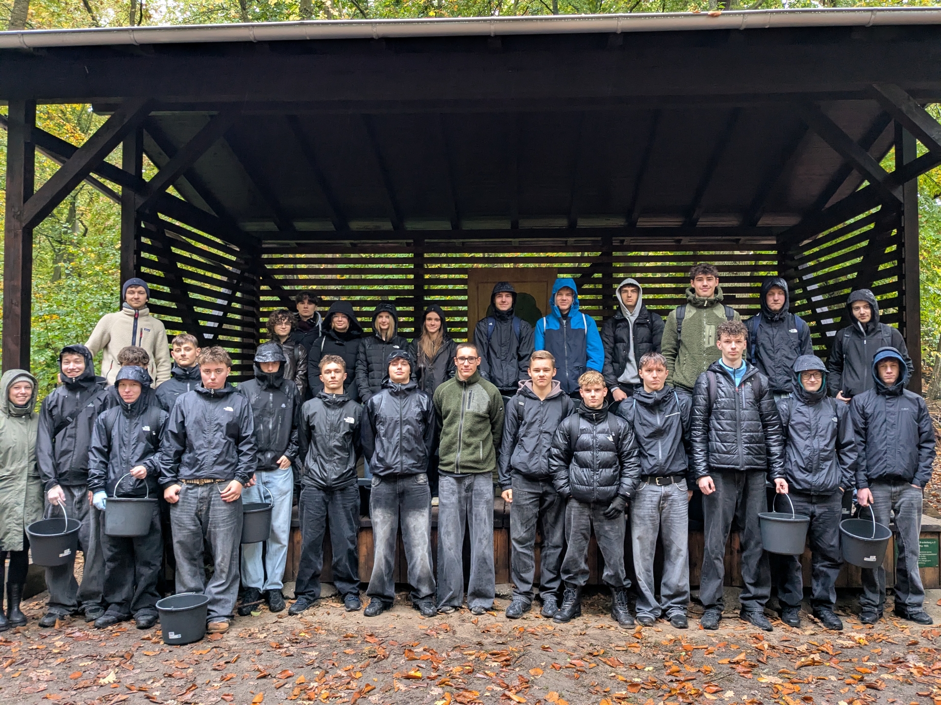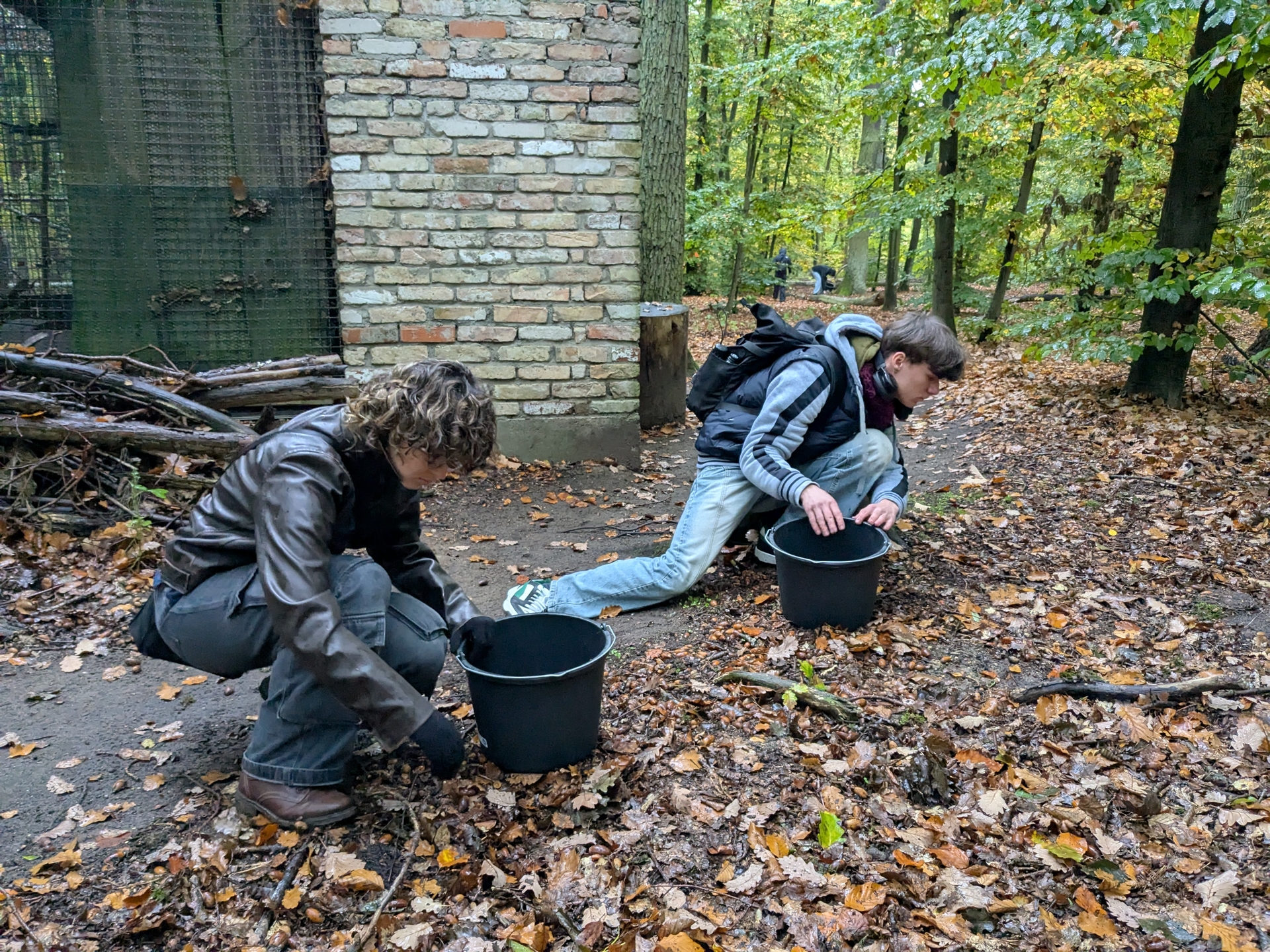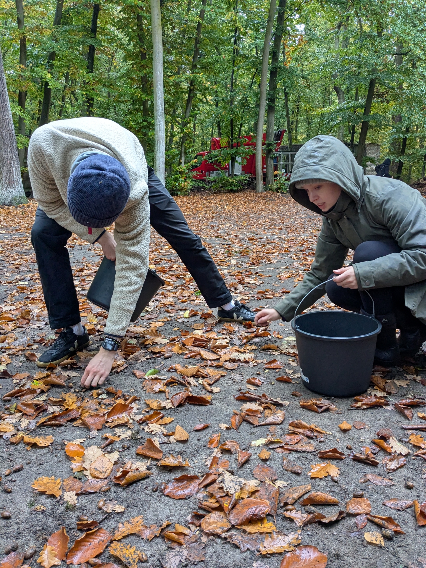 So entstand die Idee, eine ganze Schulklasse zur Saatguternte und zwar dem Eicheln sammeln per Hand, in den Wald zu locken. 26 Schülerinnen und Schüler sowie zwei 2 Lehrer der Abiturstufe des Bertolt-Brecht-Gymnasiums folgten dem Ruf und trafen sich am 15. Oktober 2025 im Krugpark. Hier finden sich besonders kräftige und wertvolle Eichen.