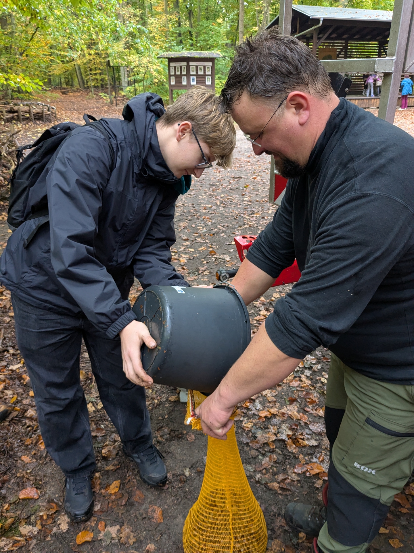 Nach einer kurzen Einweisung durch den Stadtförster Thomas Meier ging es bei regnerischem Wetter los. Die Schüler stürzten sich auf das Saatgut und schnell füllten die Eimer. Die Ruhe des Waldes wurde immer nur kurzzeitig durch die Laubbläser der Waldarbeiter unterbrochen. Sie halfen den Schülern und zeigten ihnen die besonders ertragreichen Stellen. Bald war dann auch schon das selbstgesteckte Ziel von 100 Kilogramm gesammelter Eicheln erreicht. Der städtische Forst wollte aber mehr, schließlich werden etwa 300 Kilogramm für die Aussaat auf einen Hektar benötigt. Also wurde motiviert weiter gesammelt und nach einigen Stunden war es tatsächlich geschafft, 300 Kilogramm Saatgut sind gesammelt worden!