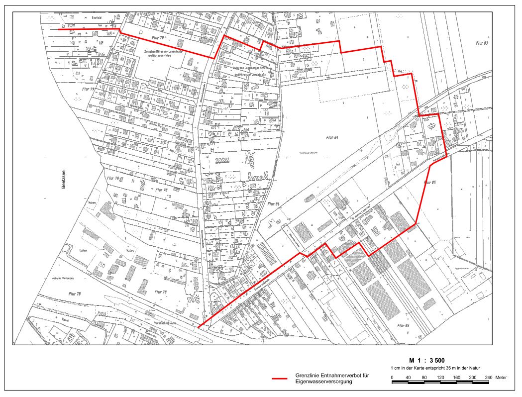 Im Januar 2006 wurde daher zum Schutz der menschlichen Gesundheit durch eine direkte (Trinkwasser) oder indirekte Schadstoffaufnahme (z. B. über die Nutzpflanze) eine Allgemeinverfügung mit einer Beschränkung der Grundwassernutzung für den menschlichen Gebrauch erlassen. Die Verfügung galt für das verunreinigte Gebiet zwischen dem Eintragsbereich und dem Beetzsee, welches Kleingärten, Wochenendhäuser, Gewerbeflächen und Eigenheimgrundstücke umfasste (Abbildung 1).