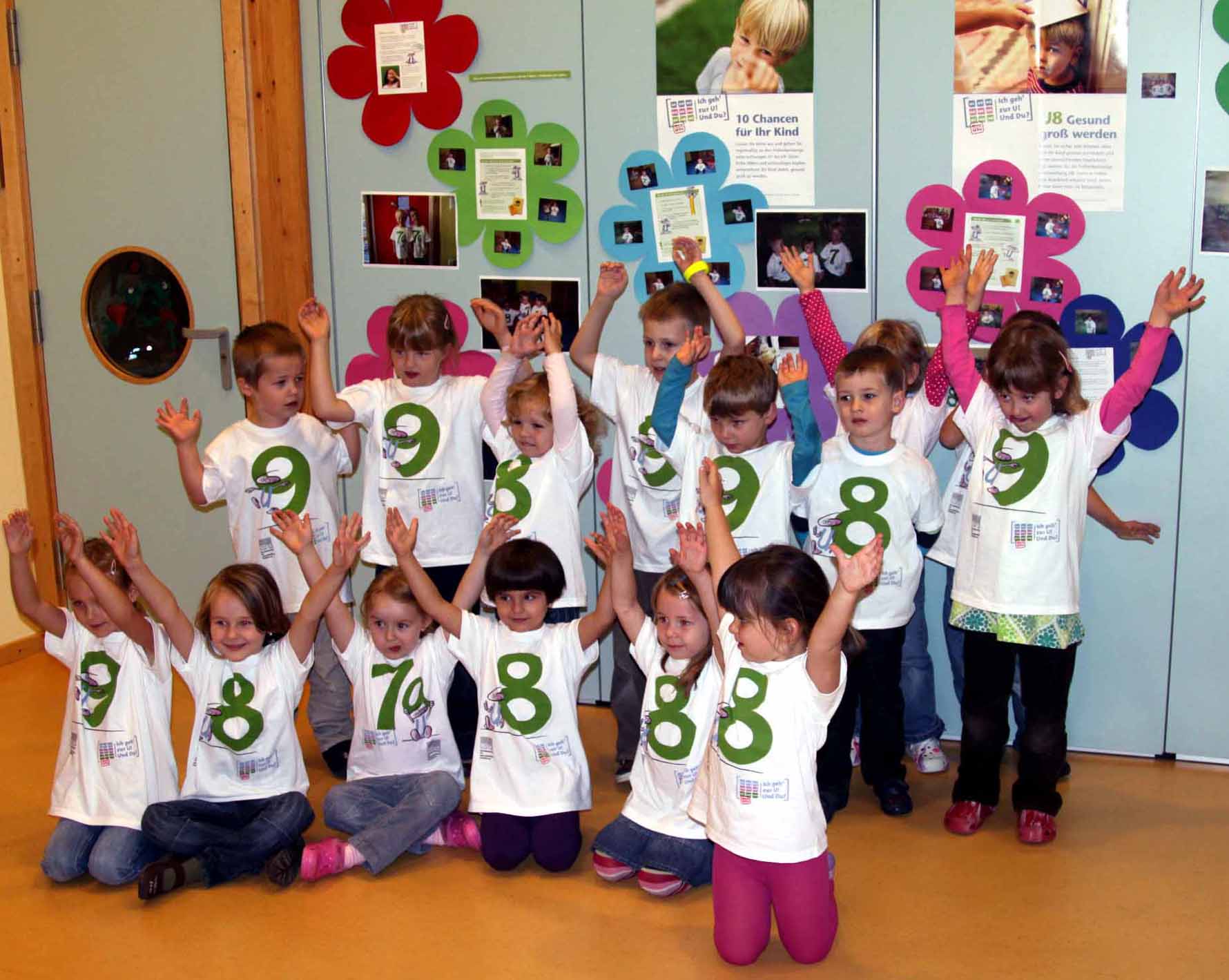 Unterstützung kam von den Kooperationspartnern (Kinderärzte, Familienpaten und Familienhelfer). Natürlich waren die U-T-Shirts und das gemeinsame Gruppenfoto ein großer Anreiz für die Kinder, die mit Stolz ihre T-Shirts tragen.