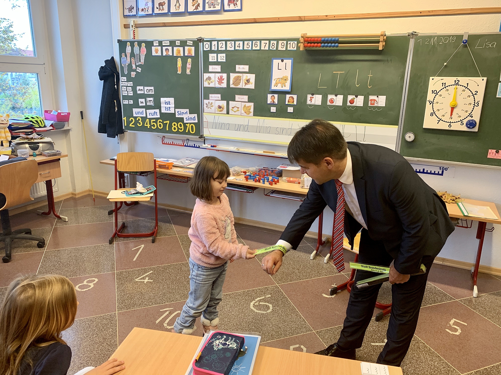 Im Rahmen der stadtweiten Aktion „Sicher zur Schule“ verteilt Oberbürgermeister Steffen Scheller gemeinsam mit Schulleiterin Elgin Belz an die Schülerinnen und Schüler der 1. Klassen der Luckenberger Schule Reflektorbänder im Stadtdesign.