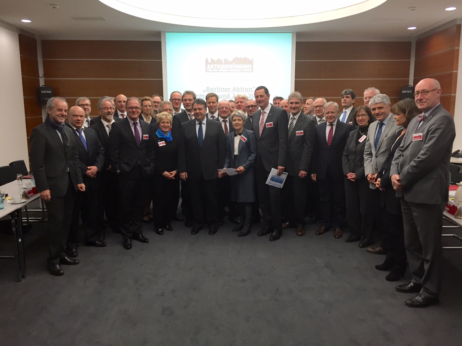Im Aktionsbündnis haben sich bundesweit 52 Städte mit mehr als acht Millionen Einwohnern und Kassenkrediten von insgesamt 22,5 Milliarden Euro zusammengeschlossen. Diese Summe können die Städte trotz eisernen eigenen Sparens niemals zurück zahlen. Das Bündnis begründet seine Appelle an die Bundespolitik mit einer Vielzahl von Gesetzen, die in der Vergangenheit ohne ausreichende Gegenfinanzierung zu Lasten der Kommunen erlassen wurden. „Deshalb traten wir heute in Berlin nicht als Bittsteller, sondern mit der Forderung nach Gerechtigkeit auf“, erklärten alle Oberbürgermeisterinnen, Oberbürgermeister und Kämmerer. Dass ihr gemeinsamer Auftritt in Berlin ernst genommen wurde, bewies eine zusätzliche Begegnung am Abend mit Vizekanzler und Wirtschaftsminister Sigmar Gabriel.