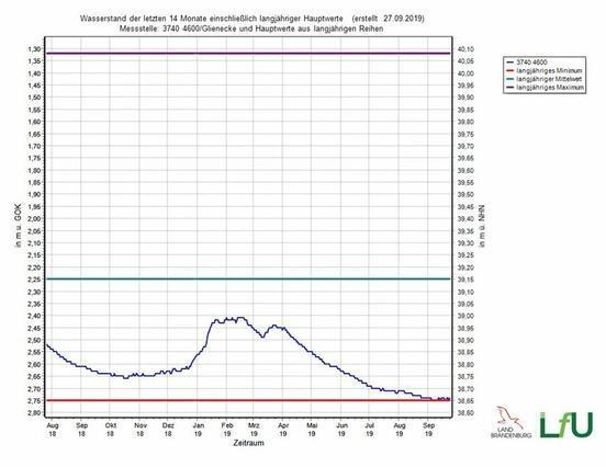 Die Situation im Wasserhaushalt bleibt allerdings weiter angespannt. Auch die Niederschläge der vergangenen Tage haben nur wenig zu einer Entspannung der hydrologischen Situation beigetragen. Die Grundwasserstände stagnieren weiter auf historisch niedrigem Niveau (siehe Grafik).