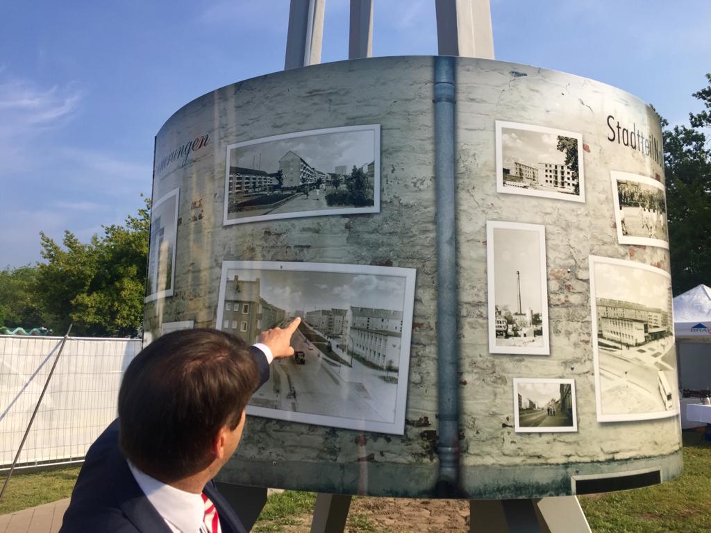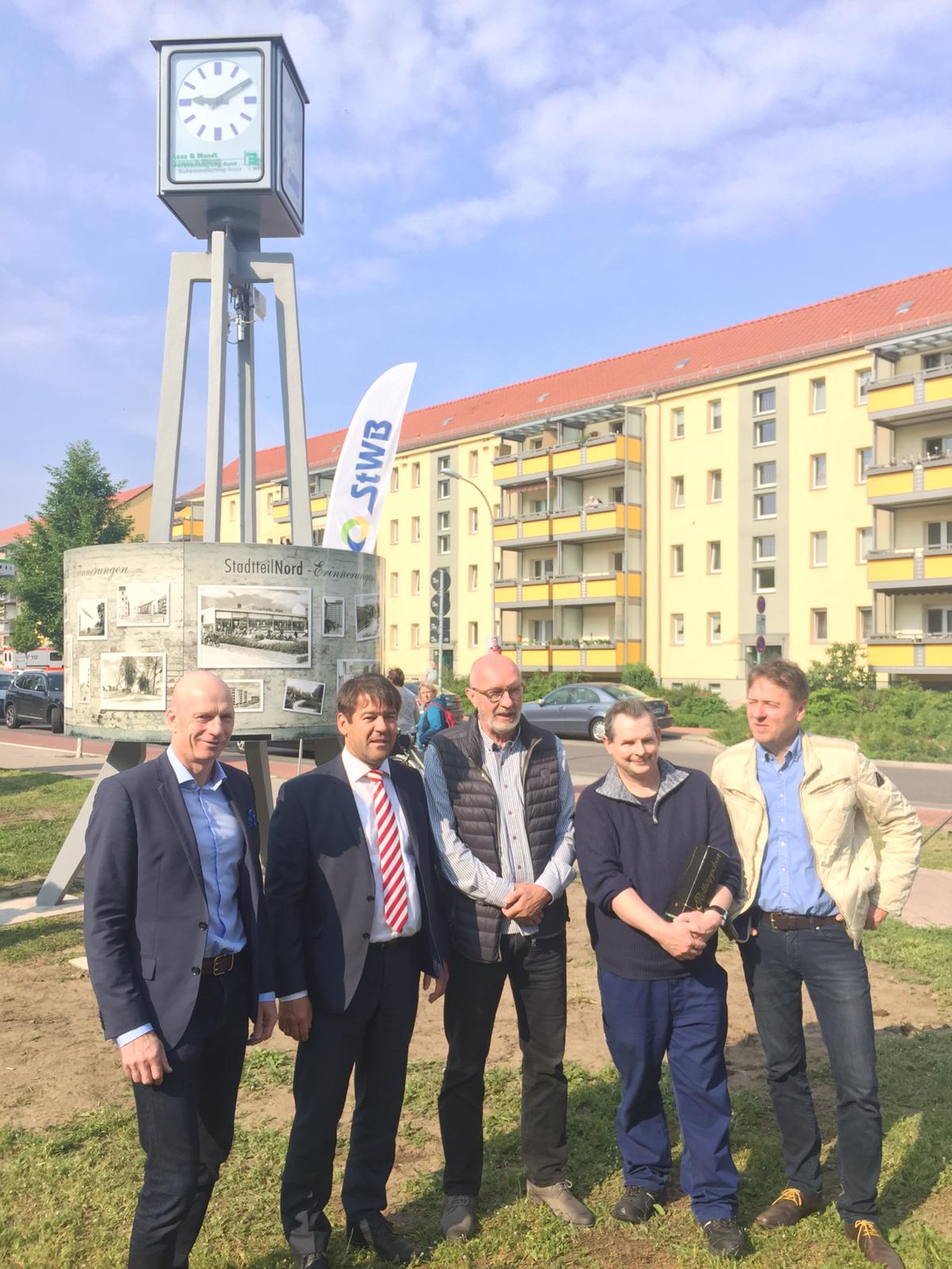 Im Beisein des Oberbürgermeisters Steffen Scheller, der Geschäftsführer beider Firmen sowie Mitarbeitern der am Bau beteiligten Firmen und Bewohnern von Nord wurde die ‚Uhrengeschichte‘ erzählt.